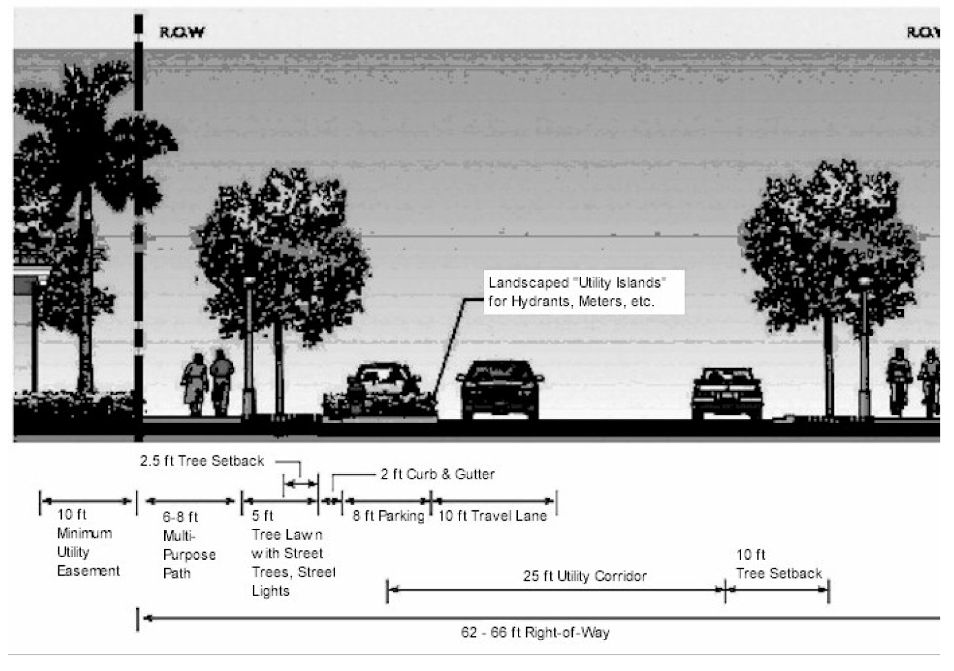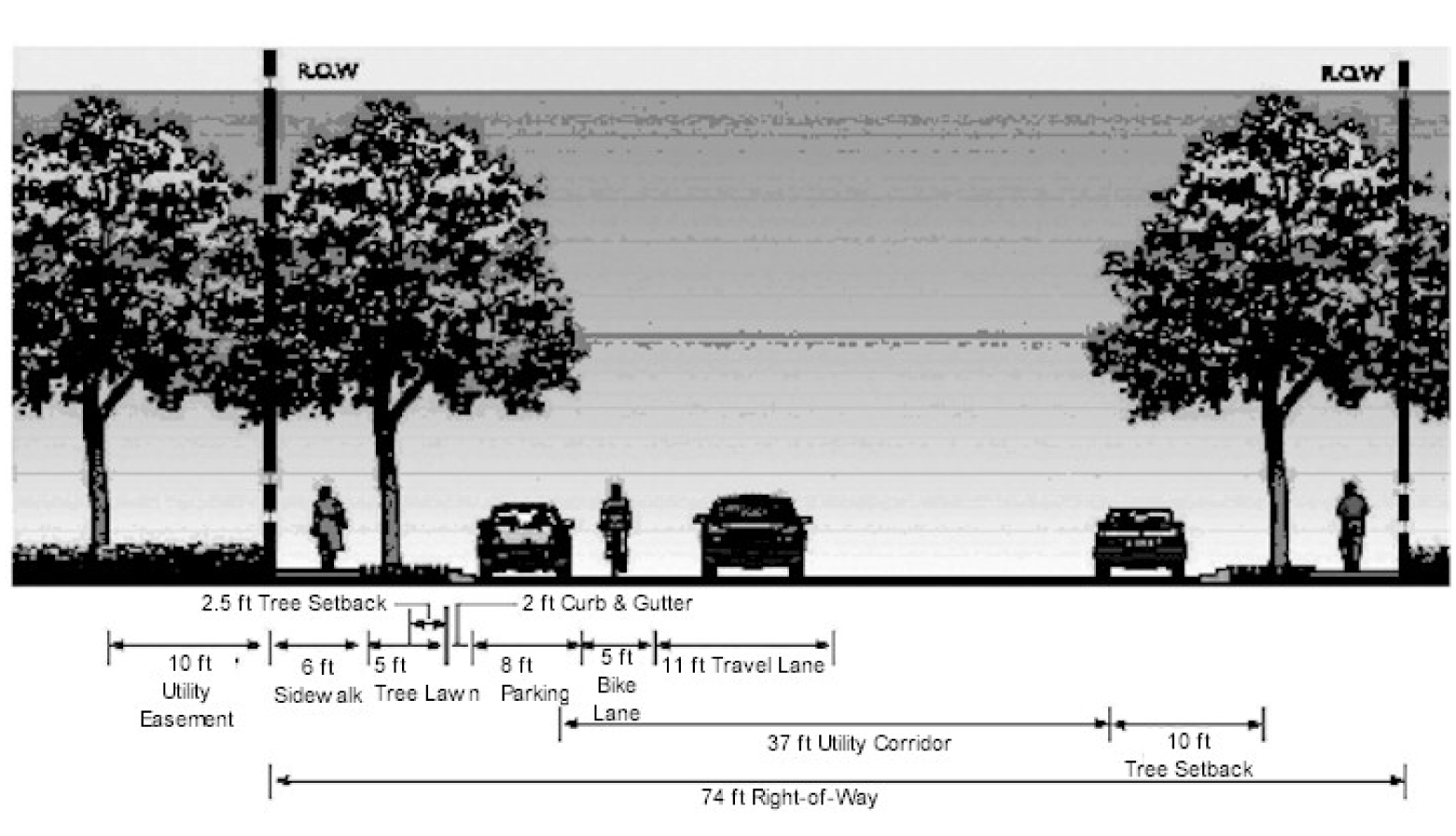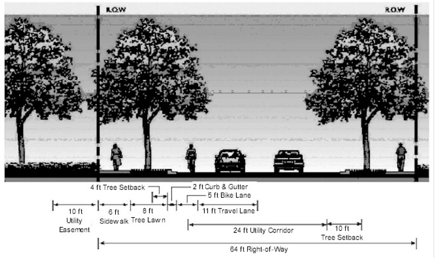 The minimum street right-of-way for local streets shall be 50 feet when constructed with curb and gutter and 60 feet when constructed with swale drainage. This will include the right-of-way for existing streets within or abutting the proposed subdivision.