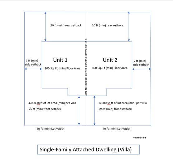two (2) attached villa dwellings constructed side-by-side. For interior lots, a side