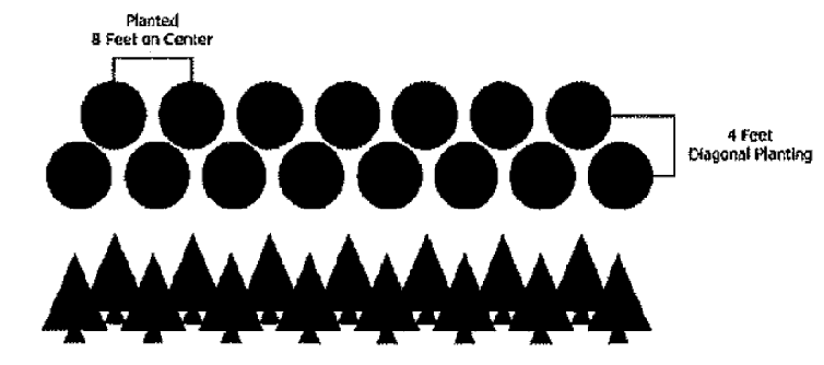 The TBY must achieve a 100 percent screen through the use of either landscape berms or trees to a minimum height of eight feet within two years of installation. To achieve this appearance with trees, a staggered spacing approach with trees on eight-foot centers, should be utilized as shown below. All TBY landscaping shall be evergreen trees. Trees and/or landscape berms may be placed on either the inside or outside of any required fencing. The TBY must be kept in excellent condition, with dead or diseased trees removed and replaced on an annual basis.