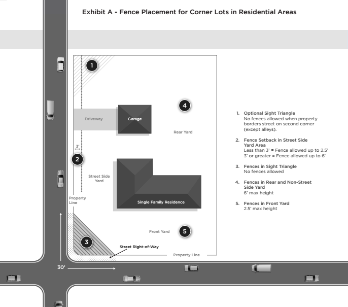 A fence up to six feet in height shall be allowed to be placed on the property line within the side and rear yards.