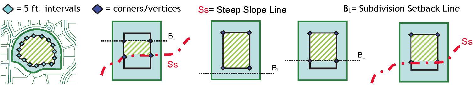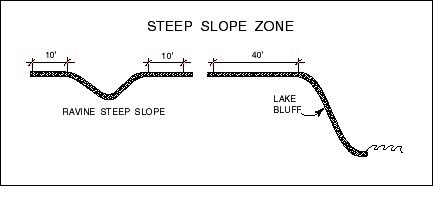 Steep Slope Zone: All land which lies between the bottom of a ravine steep slope and a line being farthest from the bottom of a ravine steep slope and ten (10) feet from the top edge of a ravine steep slope; and all land which lies between the bottom of a bluff steep slope and a line being farthest from the bottom of a bluff steep slope and forty (40) feet from the top edge of a bluff steep slope.