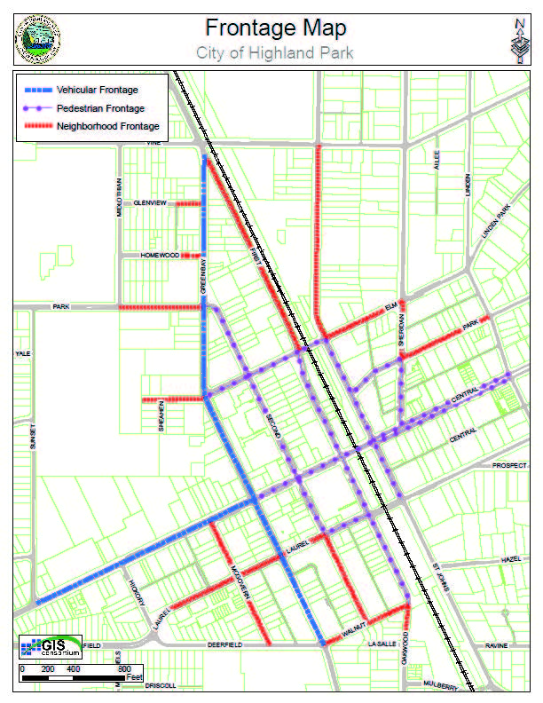 Pedestrian. The pedestrian frontage designation is applied along downtown's primary pedestrian-shopping streets, where the highest level of walkability is expected and desired. The regulations that apply to pedestrian frontages are intended to help ensure that buildings are located at the front property line and that buildings are designed to promote pedestrian interest, comfort and safety.