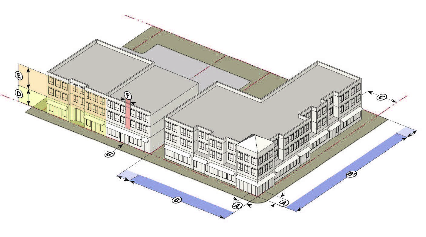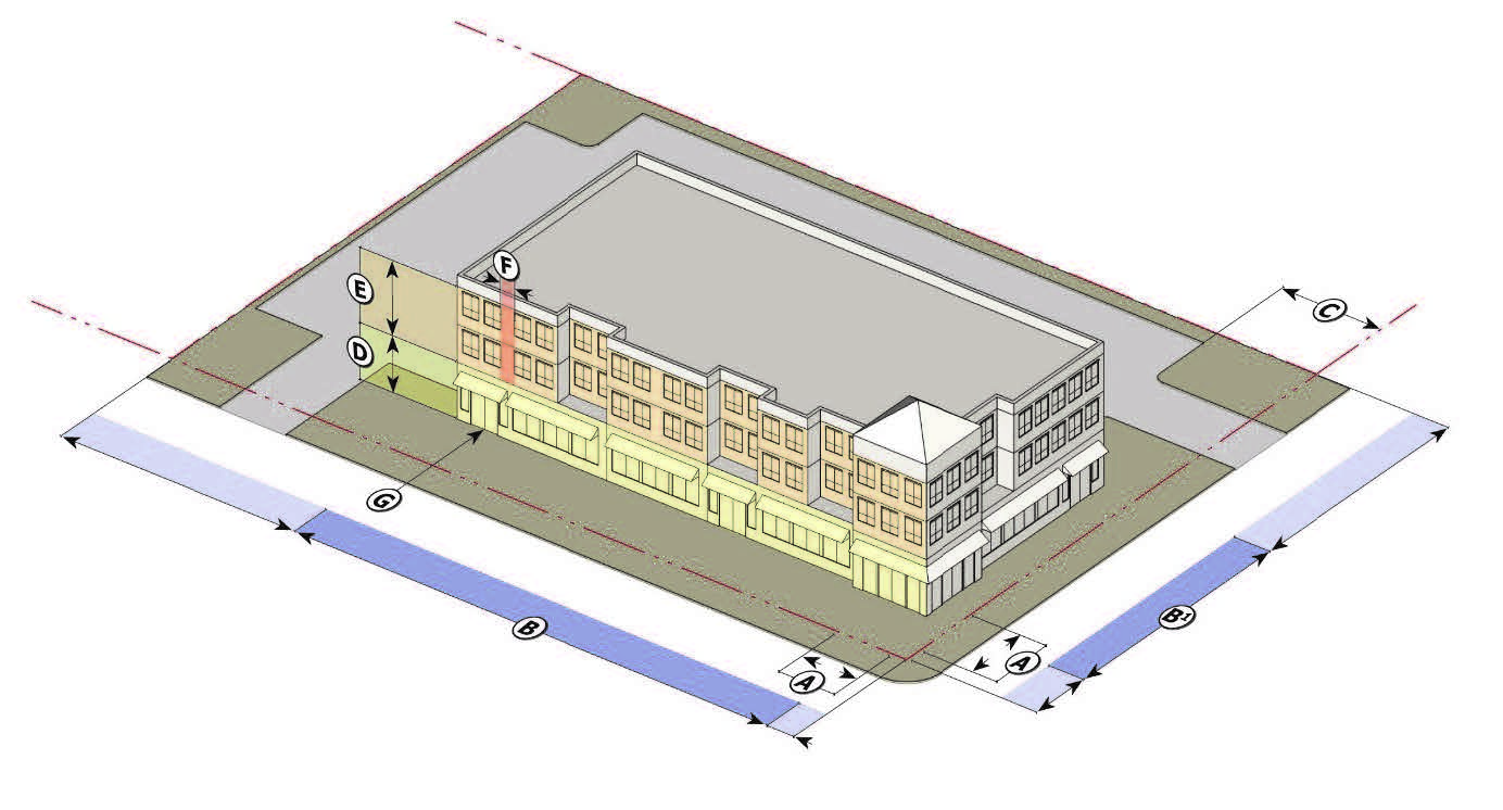 a building facade must be placed in the build-to-zone for the first 30 feet along each street extending from the corner (the intersection of the build-to-zones); and