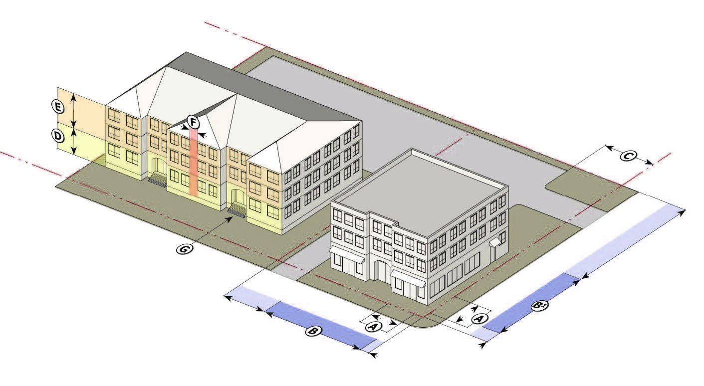 The build-to-zone is the area on the lot in which a minimum percentage of the front building facade must be located, measured as a minimum and maximum yard (setbacks) range from the edge of the right-of-way.