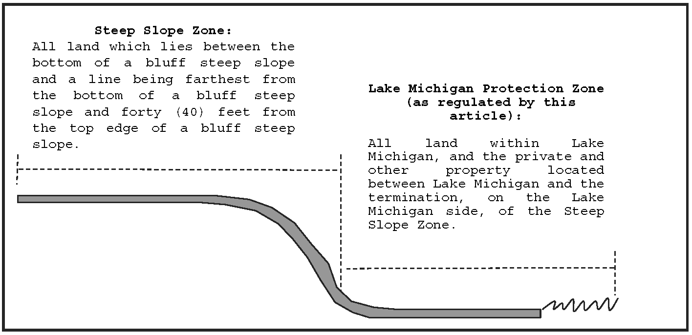 Lake Michigan Protection Zone shall mean (a) Lake Michigan, and (b) the private and other property located between Lake Michigan and the termination, on the Lake Michigan side, of the Steep Slope Zone, as depicted below.
