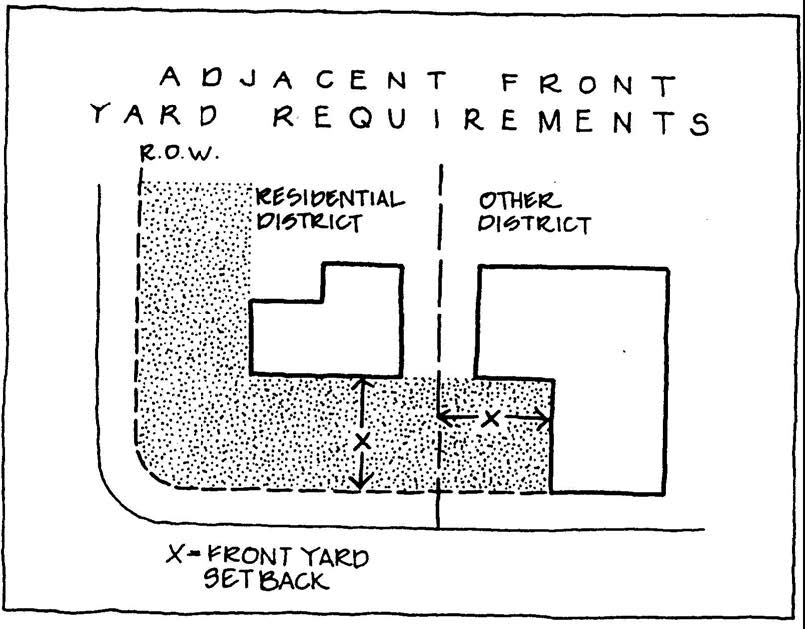 Where two districts with different front yard requirements are located adjacent to each other without a street or alley between them, the greater front yard requirement shall extend into and be effective in the district having the lesser front yard requirement for a distance equal to the greater front yard requirements. (See illustration)