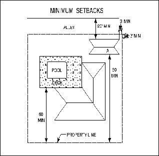 Except as provided by Subparagraph (2) of this Section 150.707(D), no accessory use or building shall be located within a required front yard or required side yard. Detached accessory buildings or uses may be built or located in the required rear yard of any zoning district, provided: (a) the total floor area of all such accessory buildings or uses on a lot do not occupy more than 30 percent of the required rear yard of the lot, plus up to an additional 200 square feet for detached accessory garages in the R6 and R7 zoning districts; (b) any structure in the required rear yard must be constructed at least three feet from the side and rear property lines of the lot upon which it would be located, provided that in the event the rear yard abuts a public alley, no building or structure shall be constructed within 20 feet of the side of the alley opposite the rear yard the alley abuts; and (c) swimming pools (including decks and mechanical systems) and tennis courts must be at least 10 feet from the side and rear lot lines in the required rear yards. (See illustration).