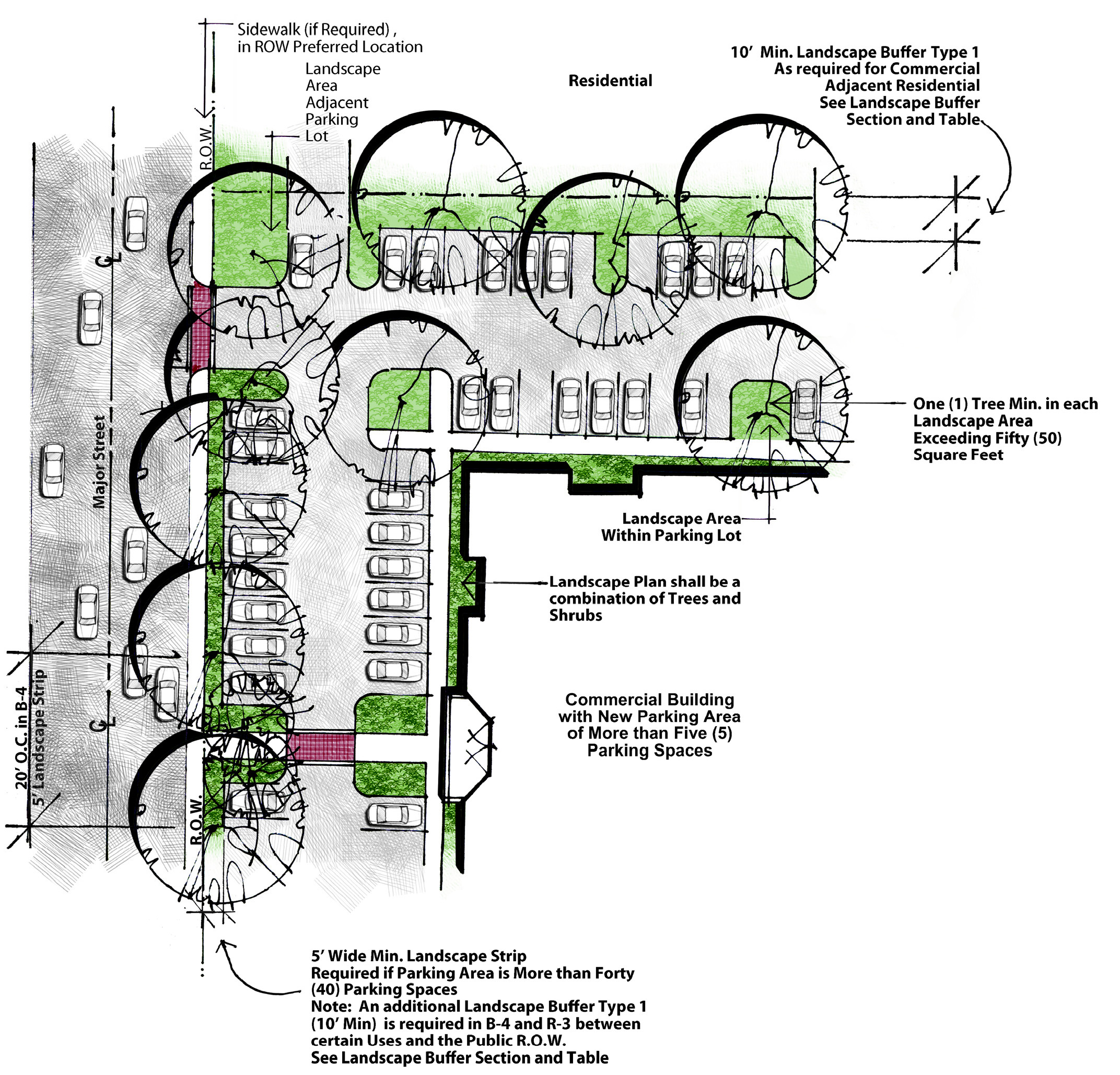 All new parking areas for commercial buildings shall provide Vehicular Use Area Landscaping as illustrated in Figure 1. Each required Landscape Area and Landscape Strip as described below shall be adequately covered with trees, shrubs, or a combination of both. Additional screening may also apply, per Sec. 11.4, Landscape Buffers and Screening.