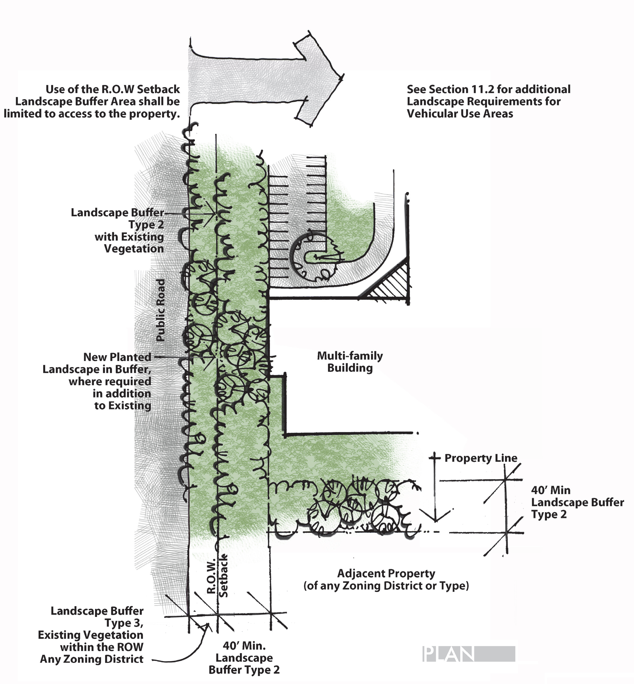 Landscape Buffer Type 2. A green vegetative buffer contiguous with public road rights-of-way (right-of-way setbacks from a North Carolina or U.S. primary route) and adjoining property lines shall be maintained as green buffers, as illustrated in Figure 3, between Multi-Family, and: (1) any property line; and (2) the right-of-way line of any public or private road meeting the following standards: