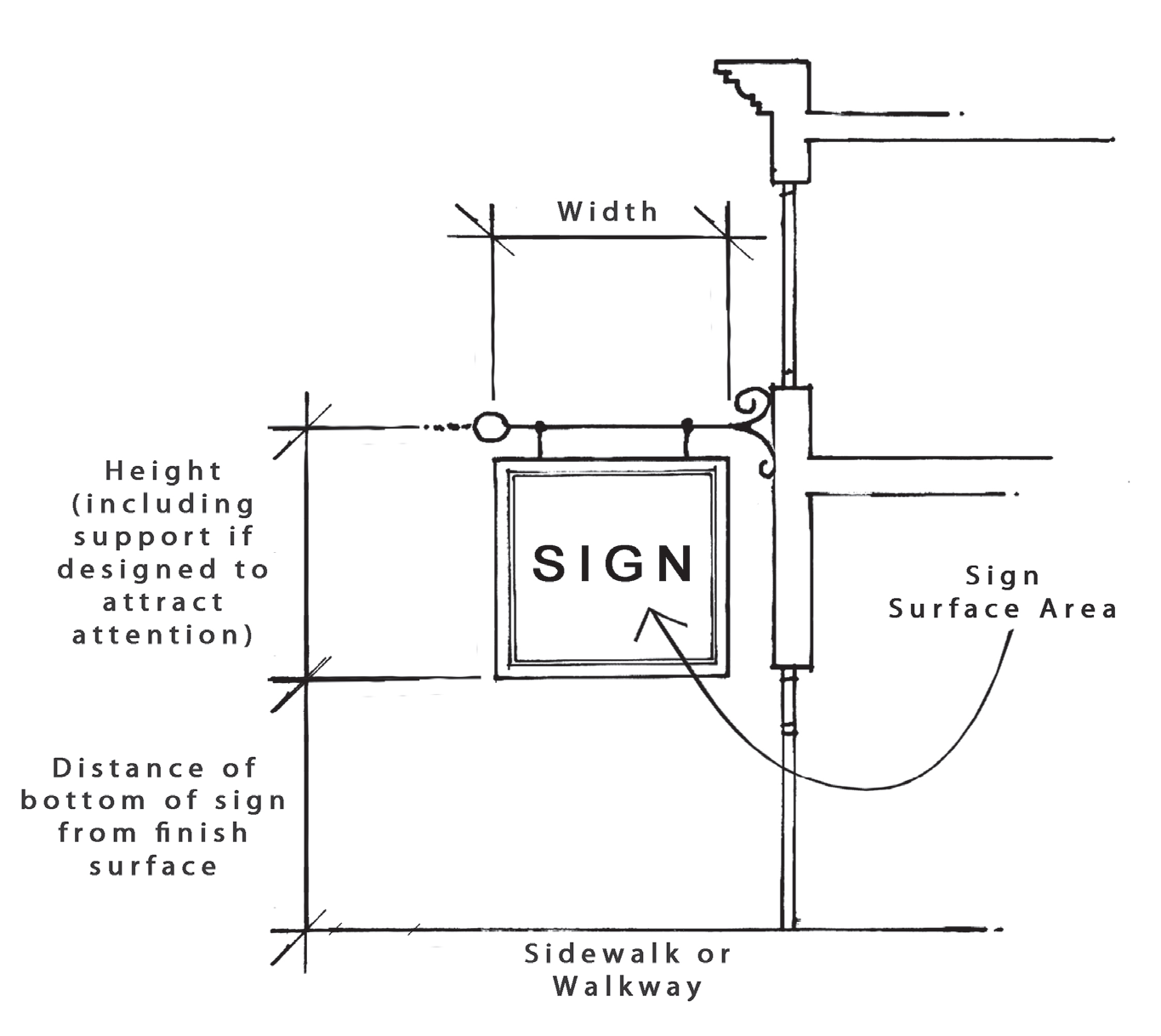 Hanging: A sign attached to and suspended at right angles (unless on a corner) to the building, and extending down over a sidewalk or walkway. Distance of bottom of sign from the finish surface of the sidewalk or walkway shall be ADA compliant and meet all of requirements of Sec. 13.5.2, Permanent Regulated Signs Requiring a Permit.