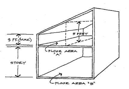 If floor area "A" is at least 40 percent of floor area "B", then "A" is a half story. (Diagram for definition # 290B.)