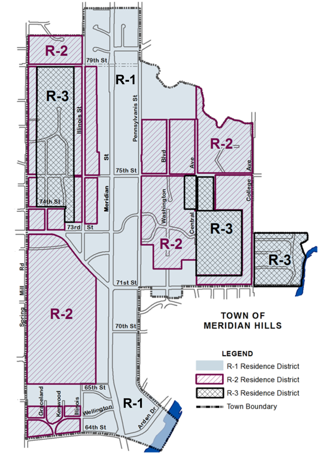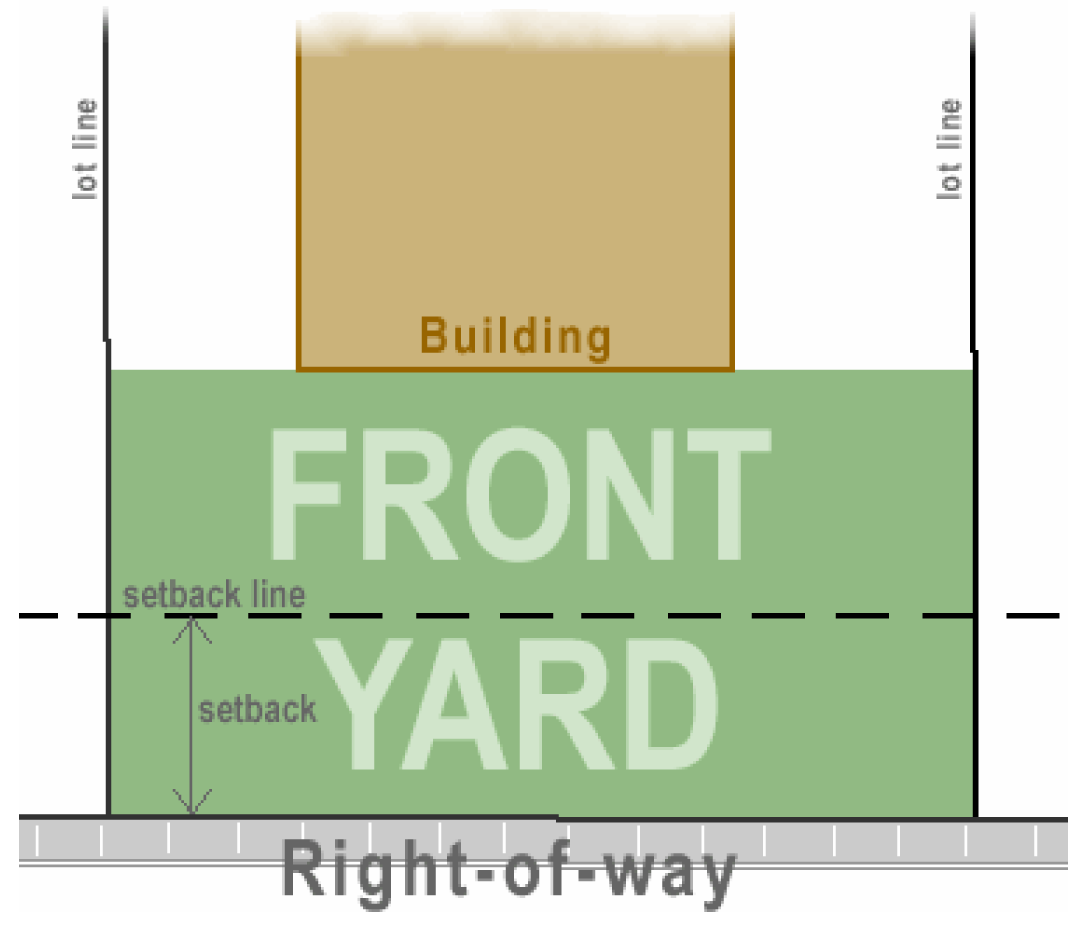 [4] Front setbacks are always measured from an existing right-of-way line unless otherwise indicated. See also Sections 744-202 through 744-204; in particular note Section 744-202.D - Front Setback Exceptions - Section 744-203.A - Land Within the Town of Meridian Hills - and Section 744-203.C - Side Yard Setback Exception for Zero-Lot Line Option.