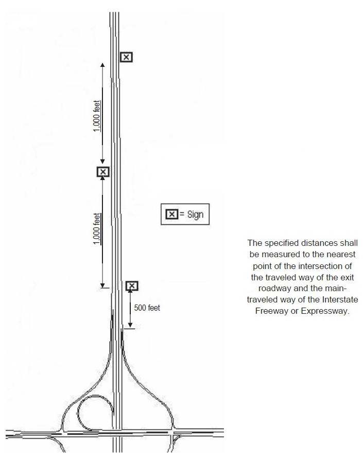 Entrance or exit roadway limitation: Signs shall not be permitted in protected areas adjacent to any freeway or expressway right-of-way upon any part of the width of which is constructed an entrance or exit roadway. No sign shall be permitted within 500 feet from the point of intersection between the traveled way of such entrance or exit roadway and the main traveled way of the freeway or expressway. Said 500 feet distance shall be measured to the nearest point of the intersection of the traveled way of the entrance or exit roadway and the main-traveled way of the freeway or expressway. (Refer to Sign Diagram 26.)