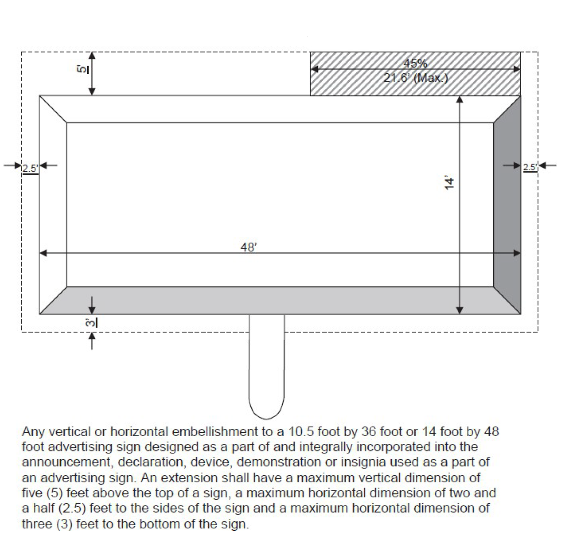 Extensions. Elements of an outdoor advertising sign may be permitted to extend beyond the horizontal or vertical sign edge. The maximum length of an extension shall not be greater than five feet beyond the top edge of the sign, three feet below the bottom edge of sign face and extend more than two and a half feet along all other sign edges. The maximum width of an extension shall not be greater than 45% of the linear length of the horizontal or vertical dimension of the outdoor advertising sign (Refer to Extension Sign Diagram 35).