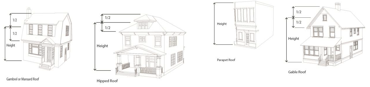 Building, height of. The vertical distance from the average finished grade to the highest point of the coping of a flat and shed roof or to the deck line of a mansard roof or to the mean height level between eaves and ridge for gable, hip and gambrel roofs.