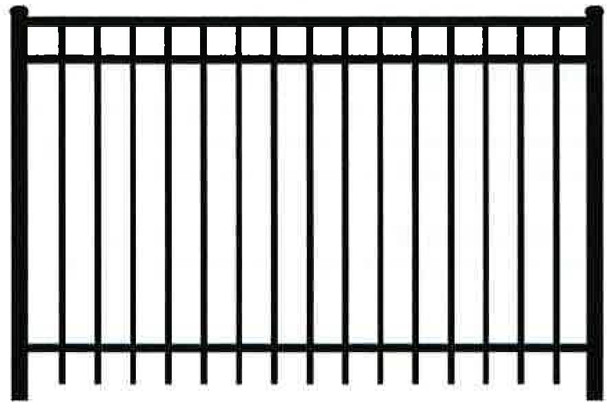 Fence, Aluminum, Wrought Iron Style means an open ornamental fence made of narrow upright aluminum, steel, or iron poles. All fences of this type must have a top rail to prevent exposed posts, similar to the diagram below: