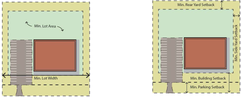Implement appropriate building and parking setback standards that accommodate redevelopment and establish continuity and consistency along the corridors;