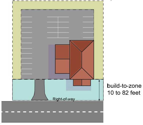 Low-Impact Auto Sub District. The front face of all principal structures shall be located in the build-to-zone. The build-to-zone for a building or structure shall be between 10 and 82 feet from the right-of-way. Architectural features including, but not limited to, signage, awnings, columns, porticos may project beyond the build-to-zone if approved by the Planning Director.