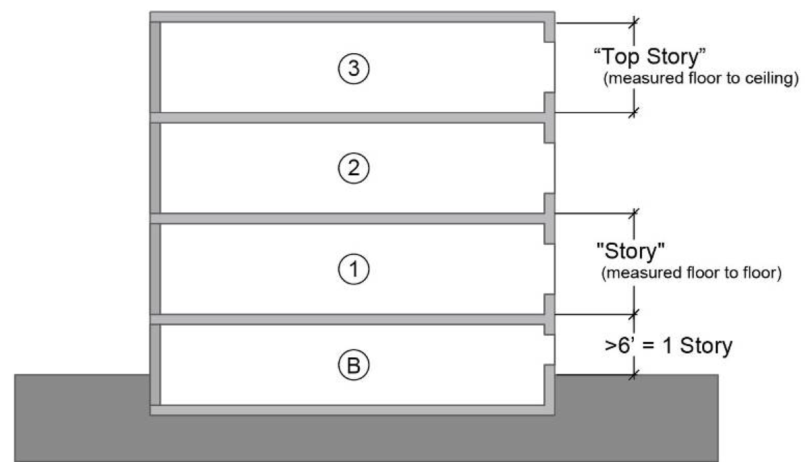 Story. That portion of a building between the upper surface of any floor and the upper surface of the floor next above, with the exception that the top story is that portion of a building between the upper surface of the top floor and the ceiling above or the roof rafters if there is no ceiling. A basement is considered a story if the finished floor level directly above the basement is more than 6 feet above finished grade. Story or stories are an internal measurement of the vertical dimension of a building, as opposed to building height which is an external measurement. Stories are illustrated in Figure 12.01.500-F.