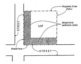 The street-line setback area is that twenty-five foot wide strip of land that is bounded on one side by the street line and on the other side by a parallel line on the lot and twenty-five feet distant from the street line, such parallel line continuing until either end of it abuts a lot line. If the lot is bounded by more than one street line, the area bounded by all street lines and their parallel lines twenty-five feet distant constitutes the street-line setback areas of the lot. The provisions of this paragraph are illustrated by the first diagram following the next paragraph.