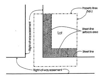 Example, on a corner lot, of street line setback areas where the "street" is a dedicated right-of-way.