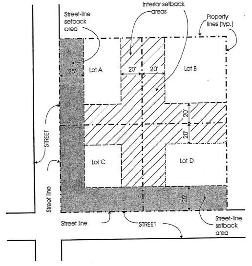 Example of some interior and street line setback areas. Note that, for clarity, not all of the setback areas are shown for Lots A, B, and D.