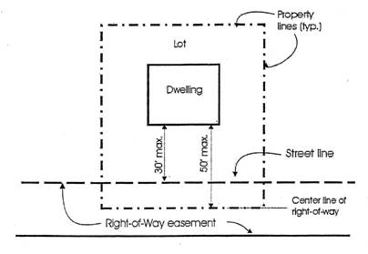 On property having frontage along a street or right-of-way established by easement (as opposed to dedication in fee), whether public or private, the outside boundary of the street-line setback area shall be the line between the easement and the remainder of the private property unencumbered by the easement, as illustrated by the second diagram below.