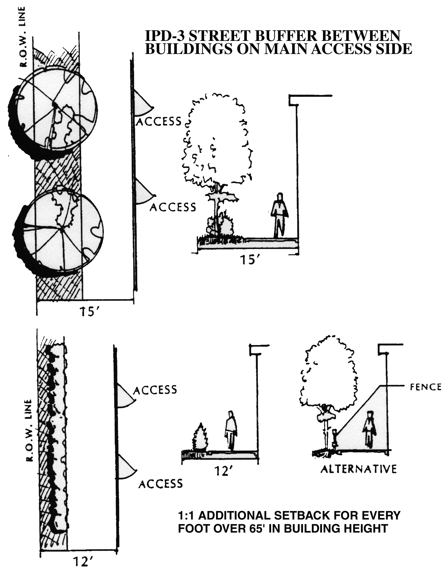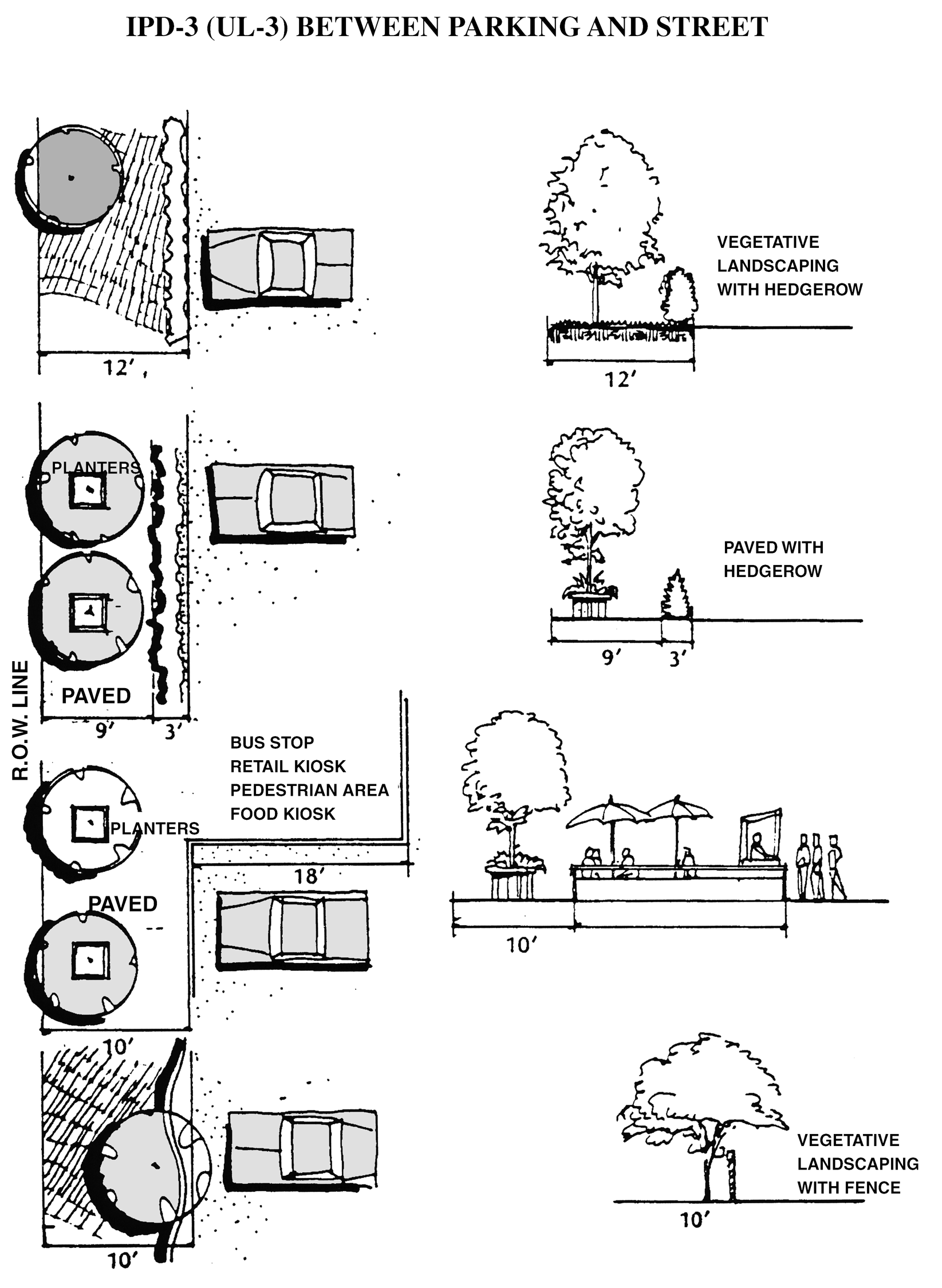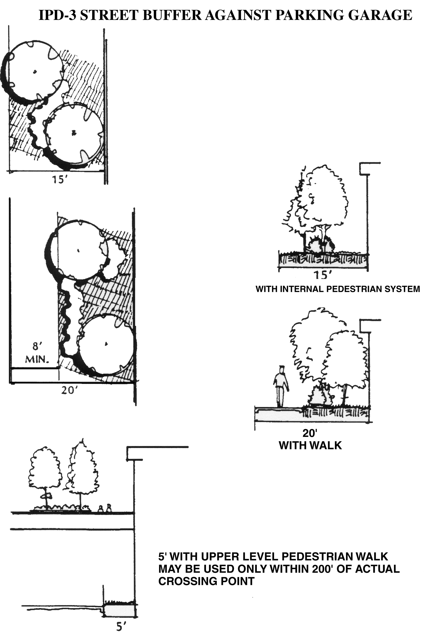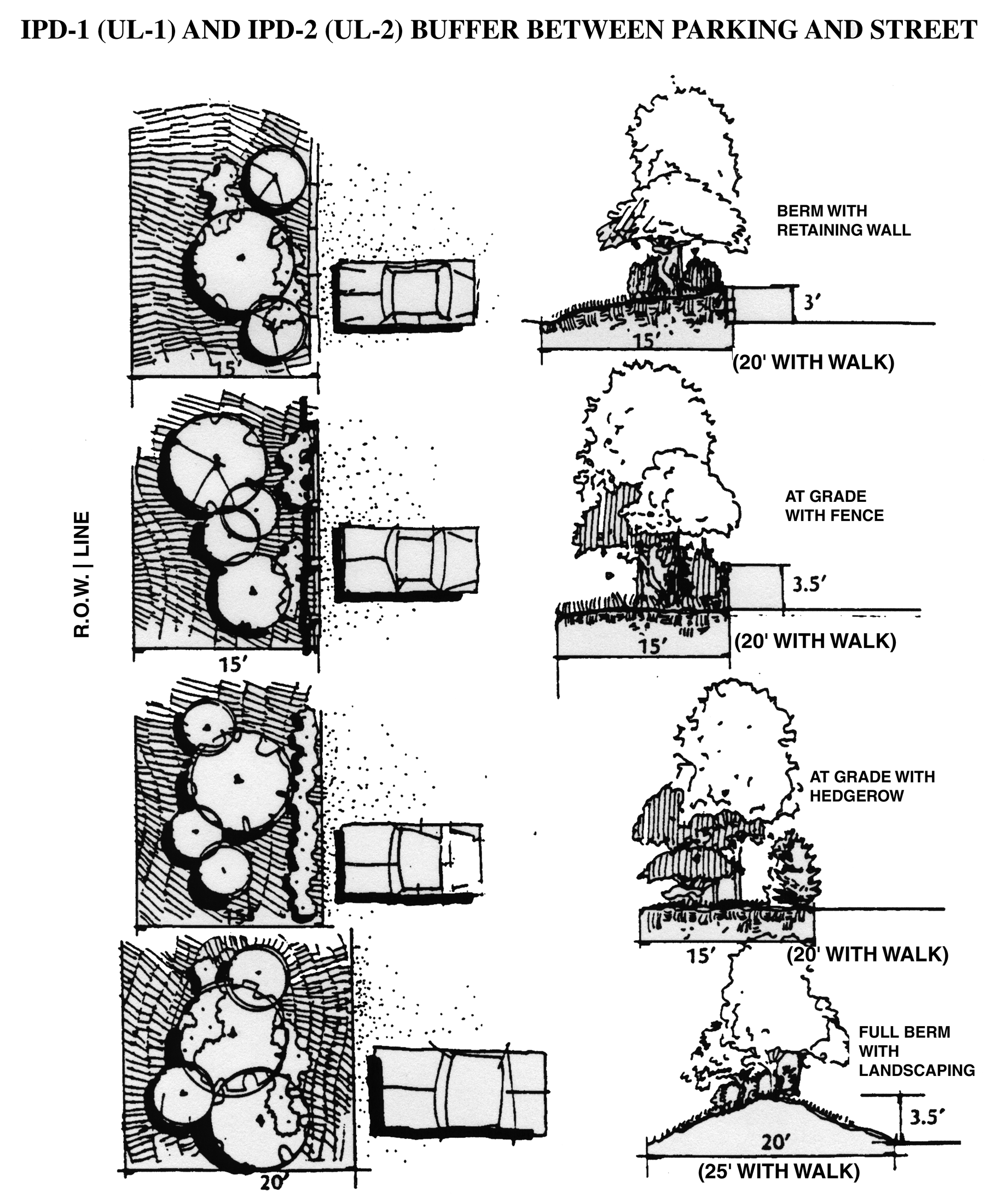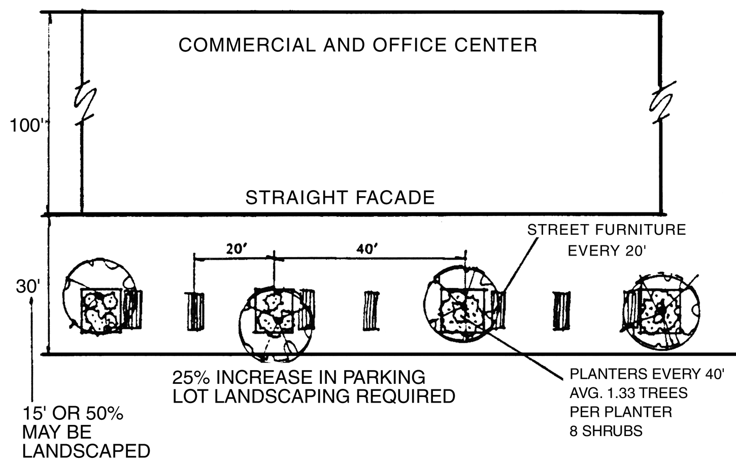 Activity centers permit any of the uses in the underlying commercial zoning. Activity centers shall provide a comprehensive pedestrian system which shall include the 40-foot parkway buffer in either of the two forms shown and a linkage to the shopping areas and any office areas. The development shall use one of the four forms described in paragraphs 1 to 4 and Figures 3.2 through 3.5 below.