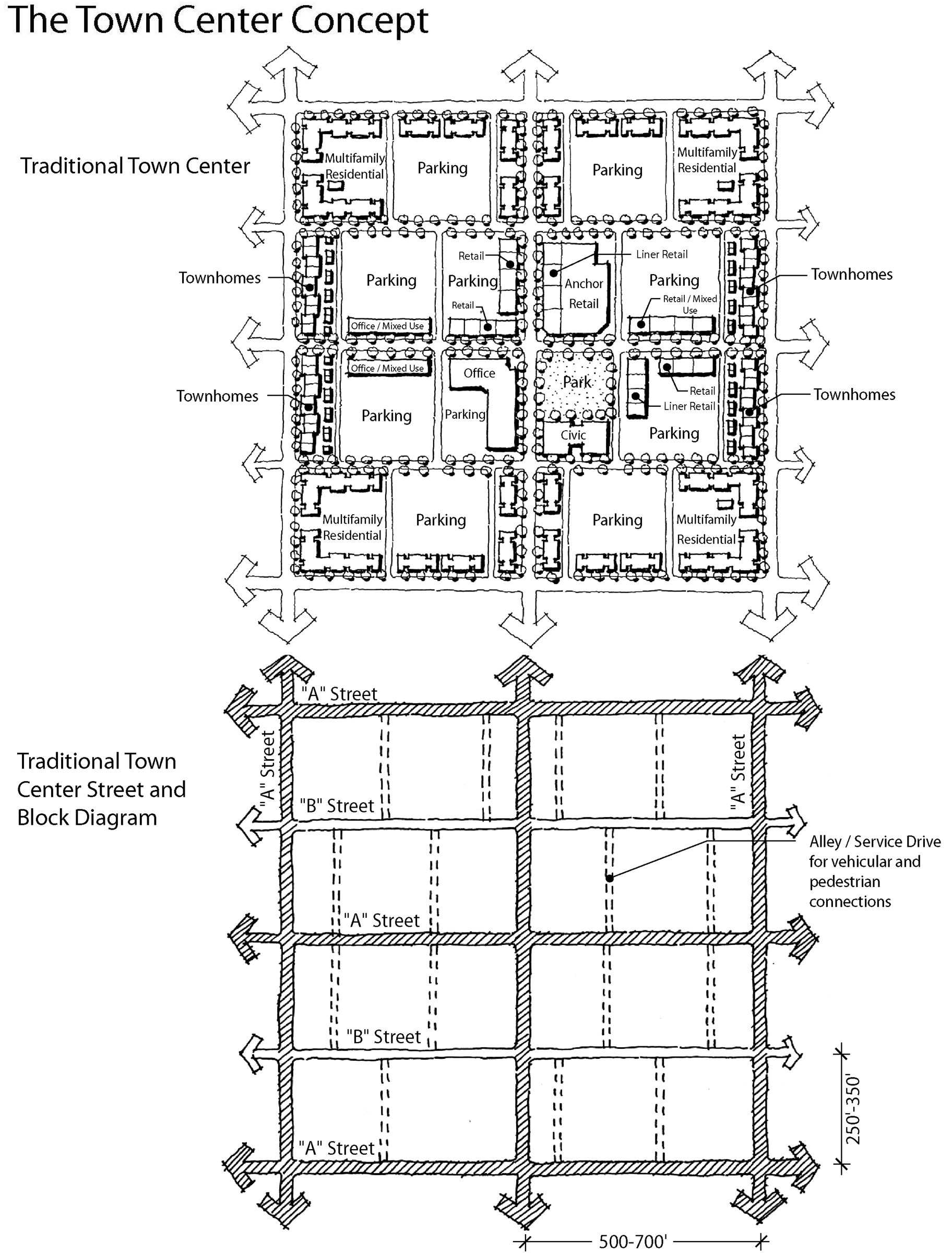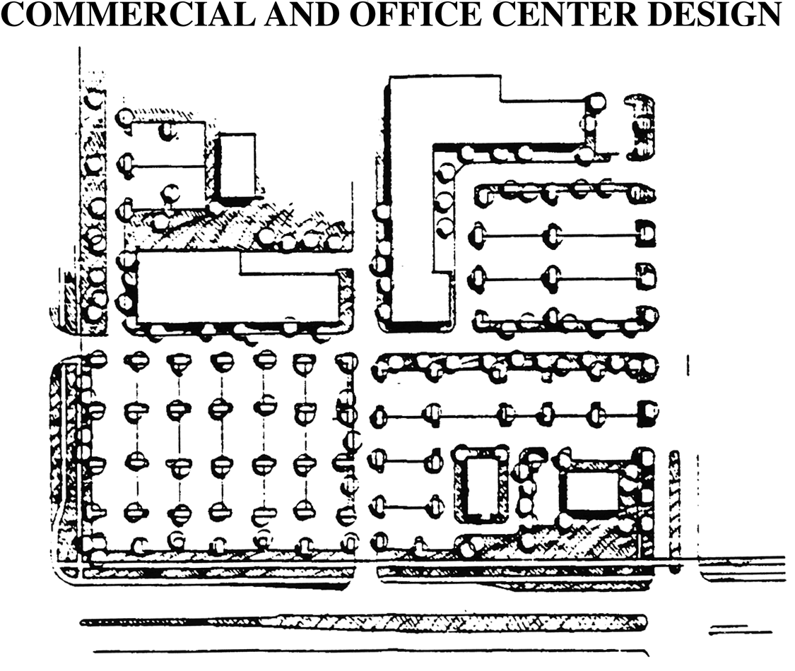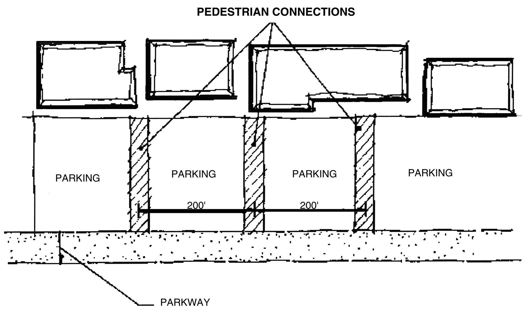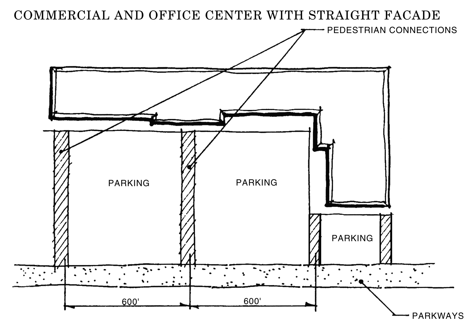 Conventional commercial and office center with a pedestrian walkway in front, and pedestrian connections to the parkway for each development or every 600 feet, whichever is greater.