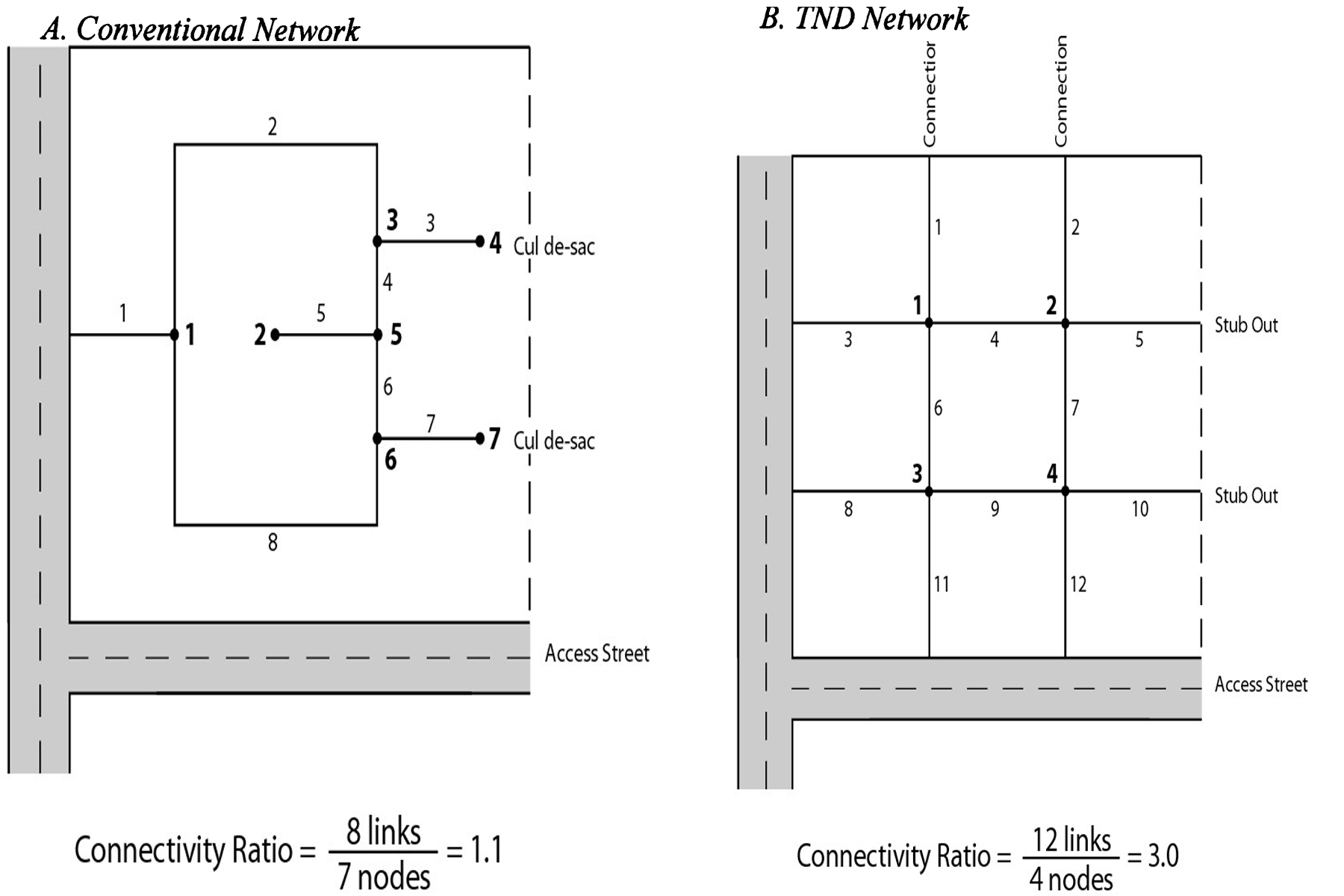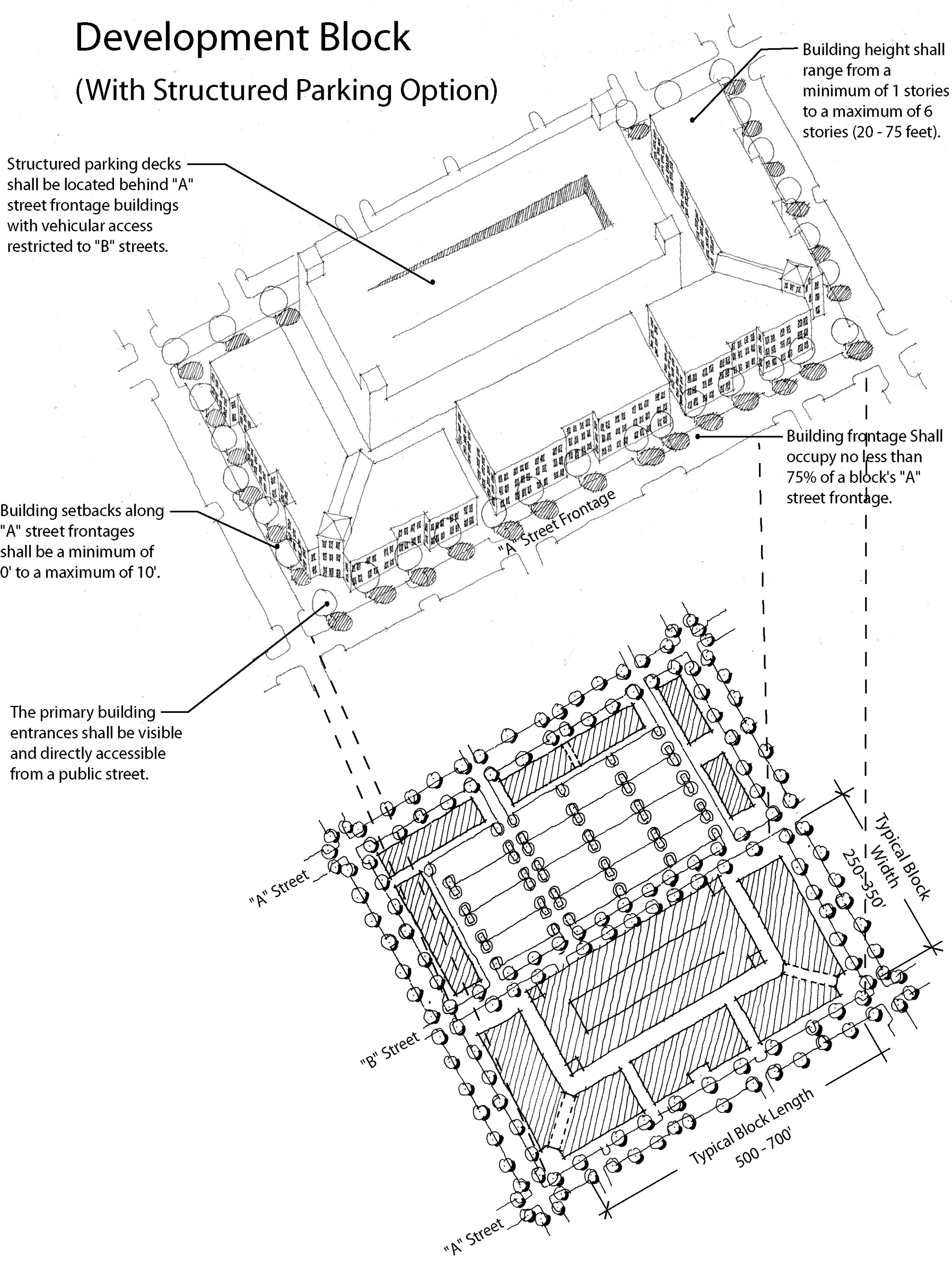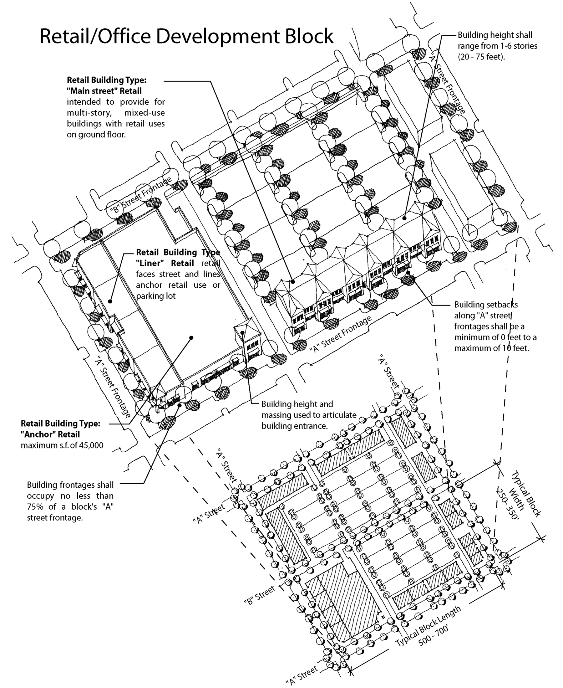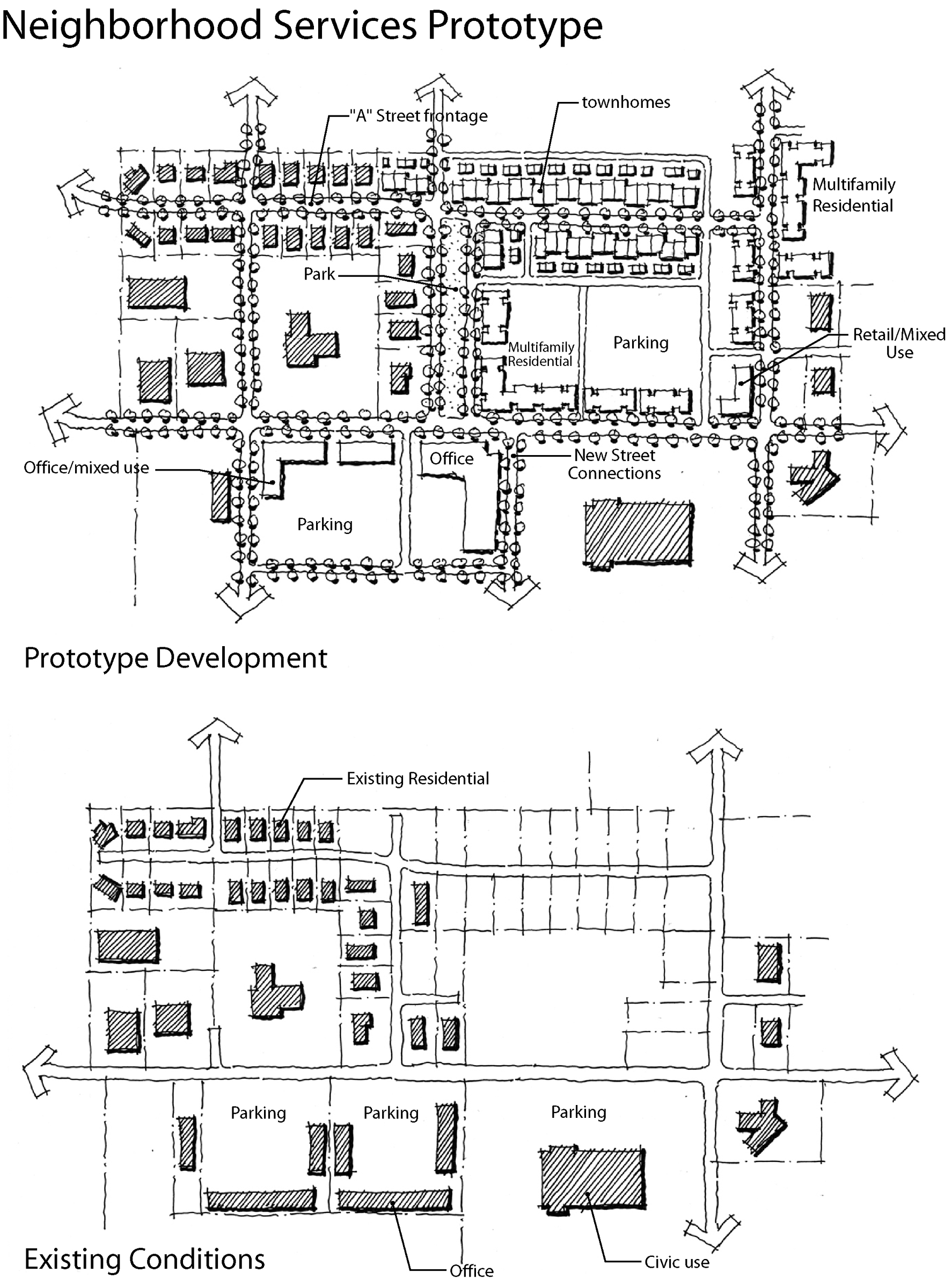Conventional commercial and office center with a pedestrian walkway in front, and pedestrian connections to the parkway for each development or every 600 feet, whichever is greater.