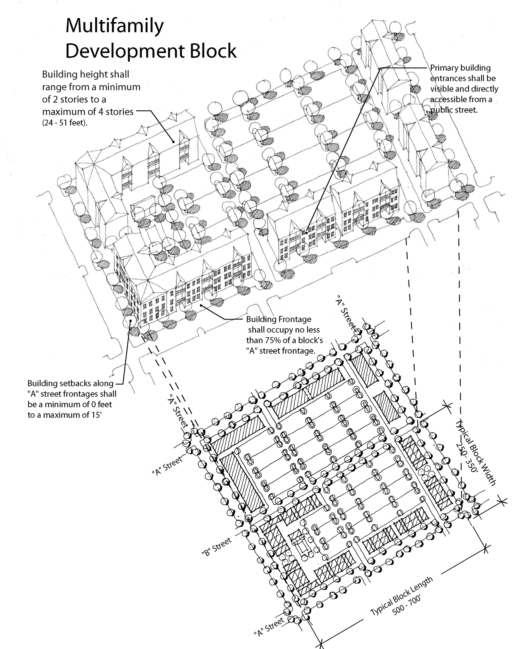 Differing Lot Types should to the greatest extent practicable be placed back-to-back on a single block to provide harmonious transitions between Lot Types. Lot Types should be selected to provide buildings of like scale and massing on opposite sides of the streets.