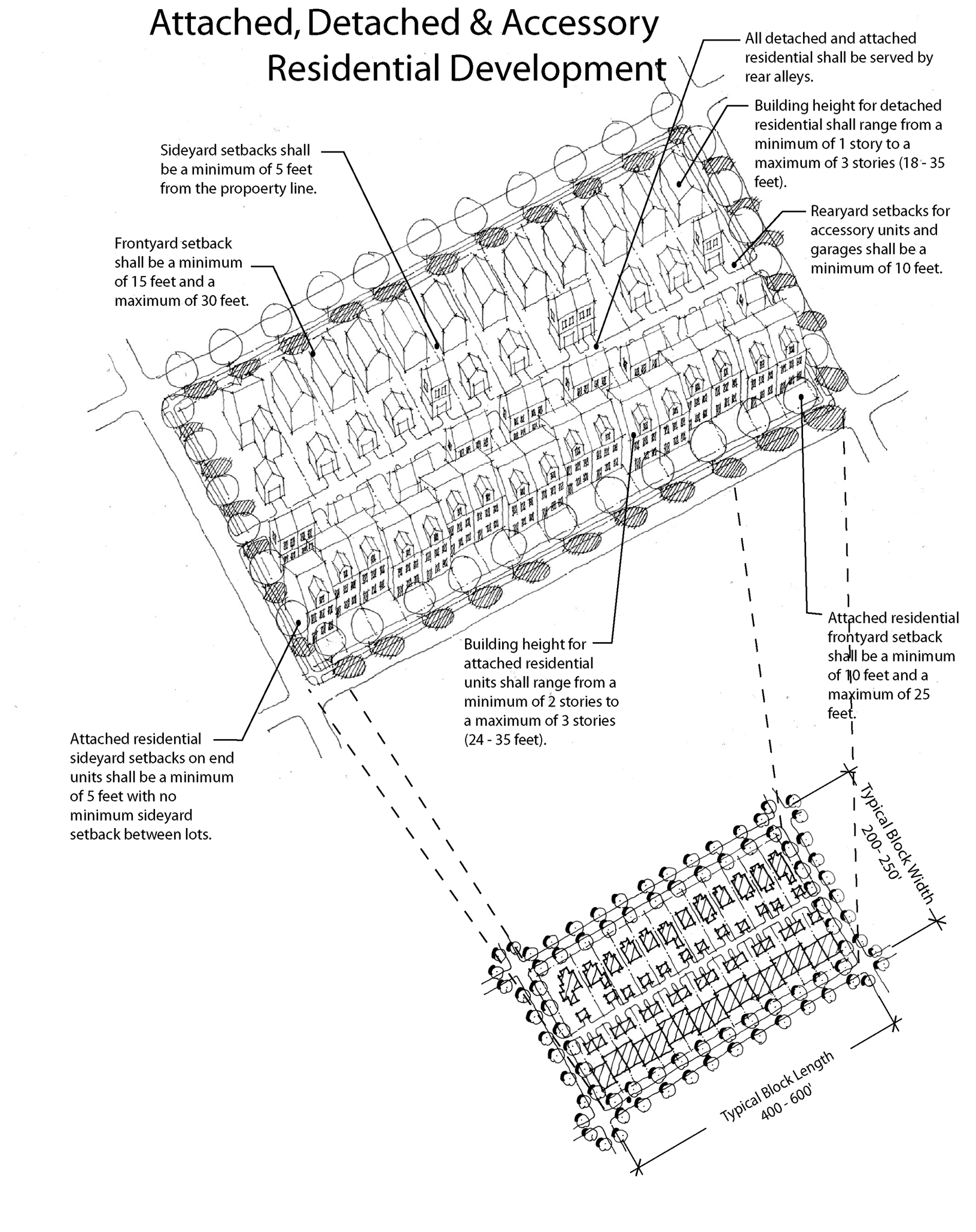 Accessory structures utilized for vehicle storage and rear access shall be placed no closer than 3 feet from the side property line. The rear yard setback shall be determined at the time of rezoning to ensure pedestrian safety relative to the rear lot boundary (Alley or public street).