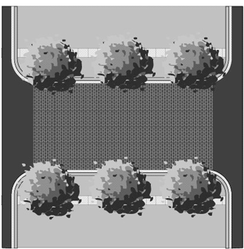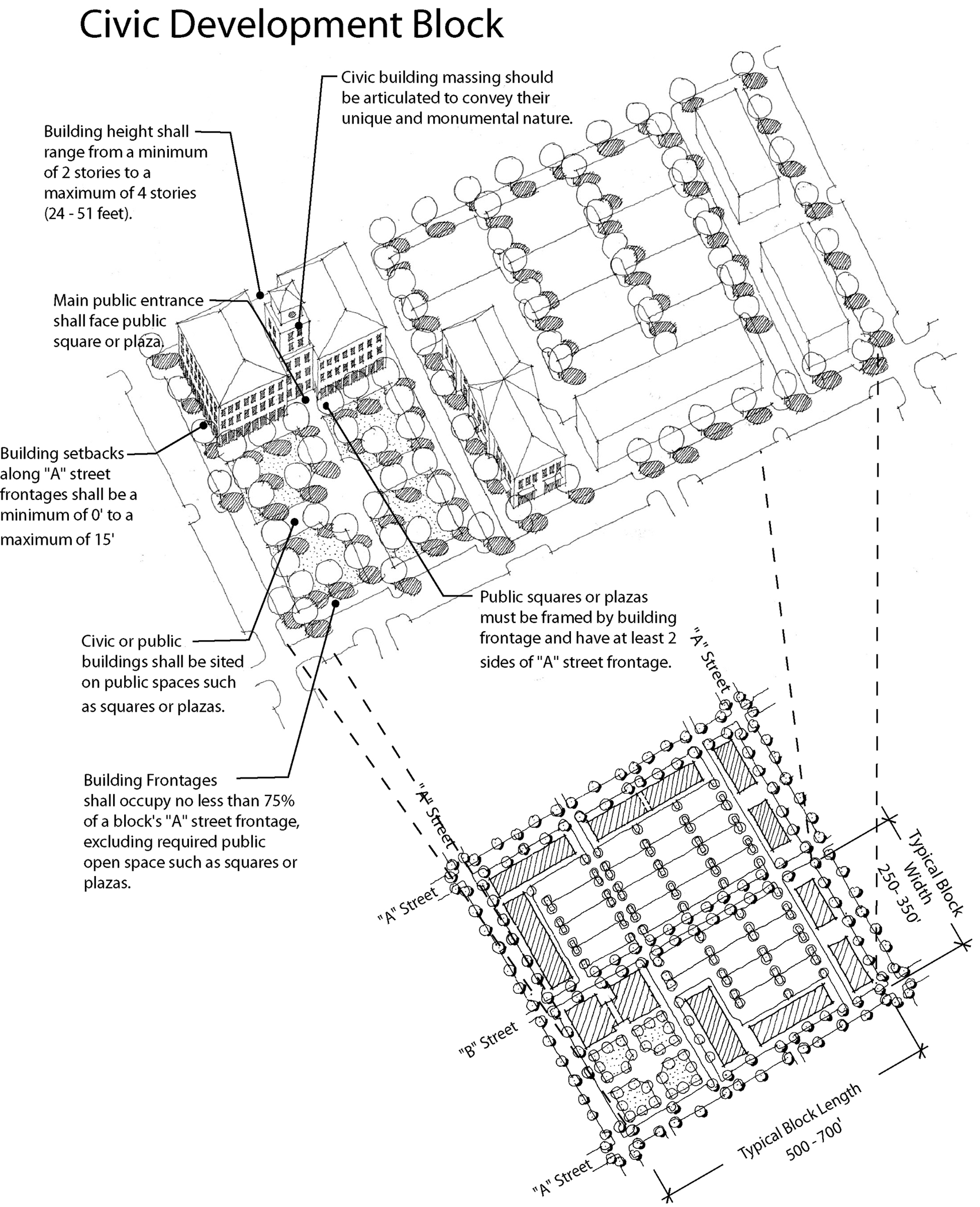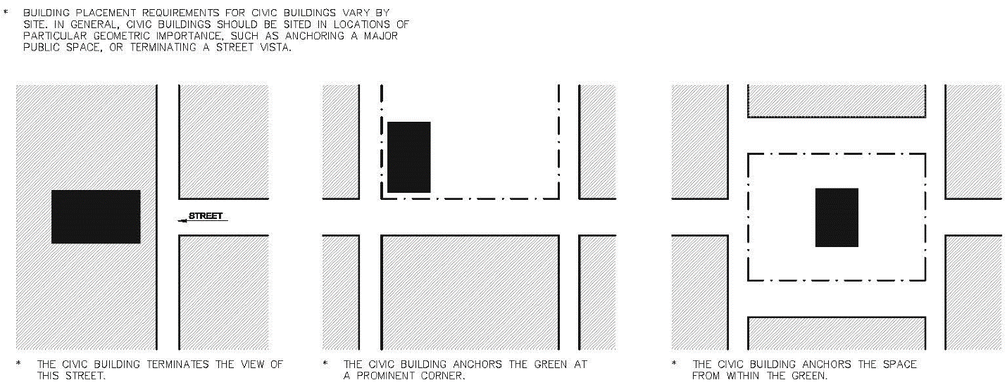 Should permitted Civic Use building be located in a Neighborhood Green, building placement shall be as illustrated below.
