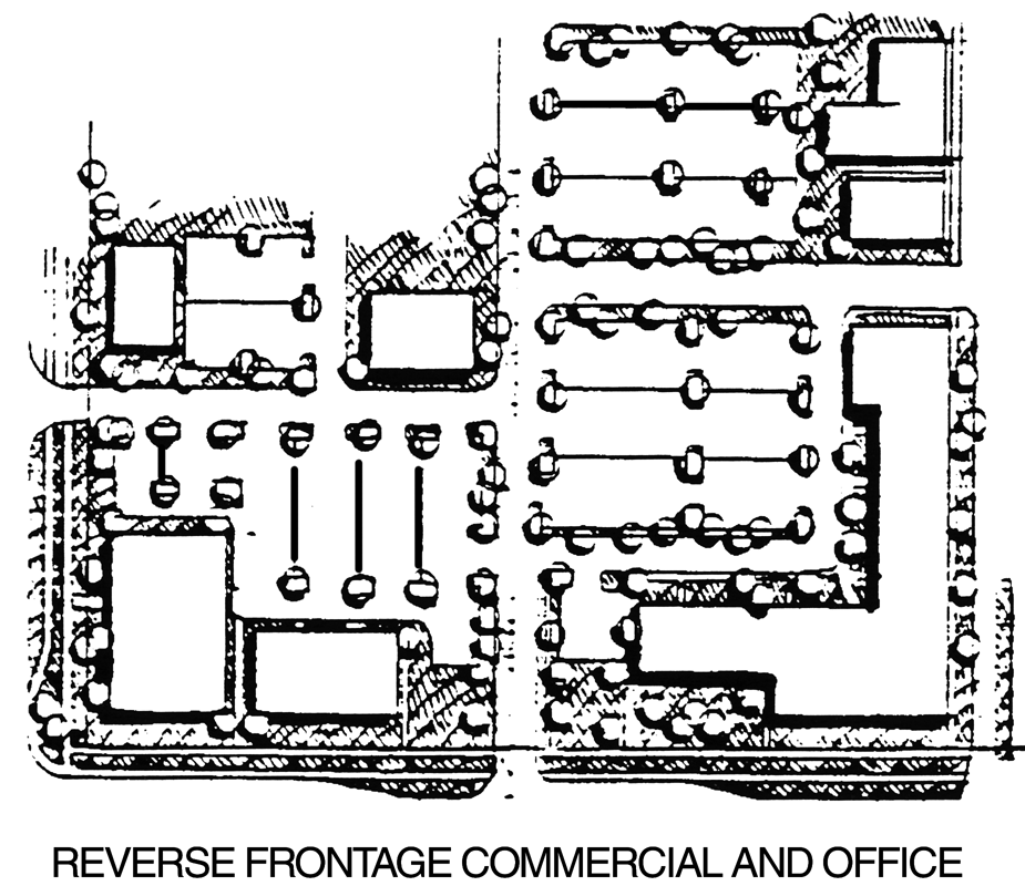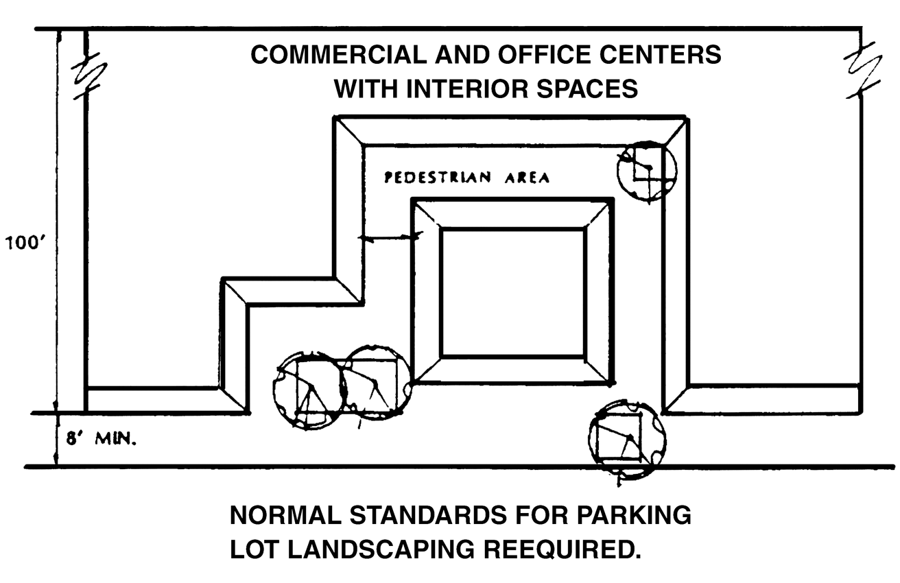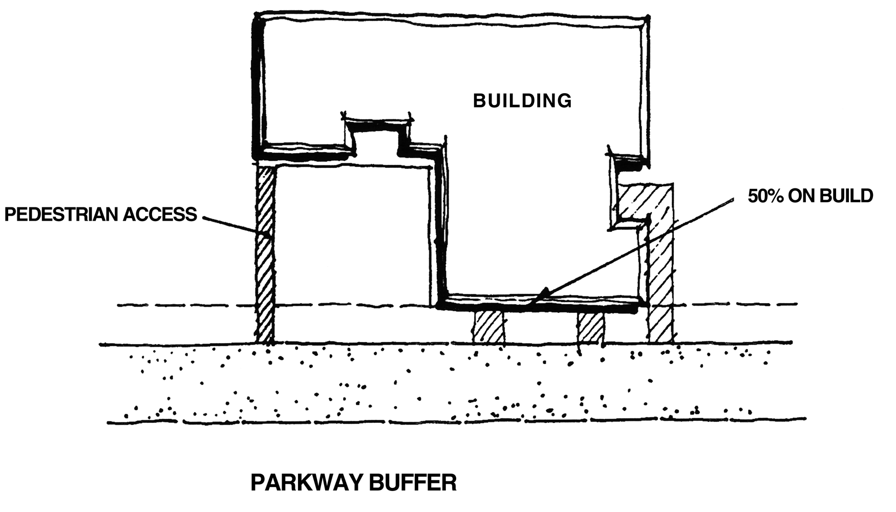 Commercial and office complexes built to the average build line, where the pedestrian walk in the parkway buffer is increased in width to eight feet and located on the property line to provide direct access to stores or offices. Pedestrian breaks which permit access from the parkway to the opposite side of the buildings shall be no more than 200 feet apart along the stores or offices.