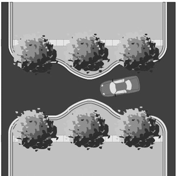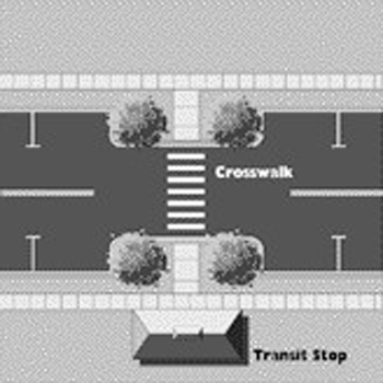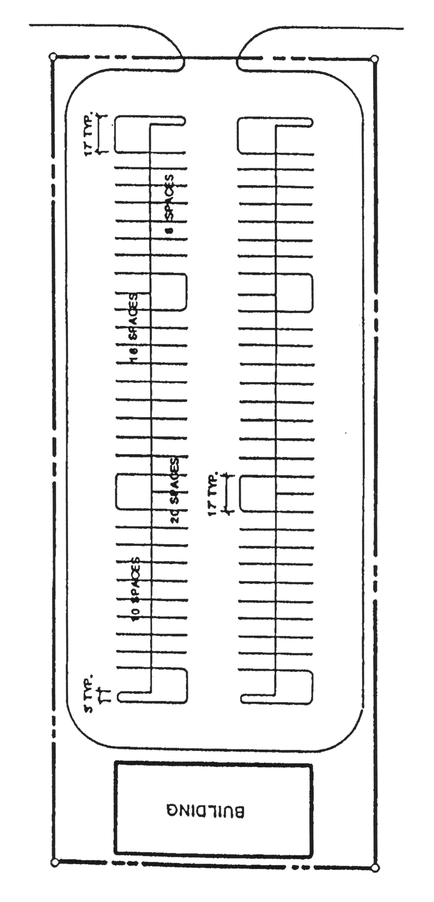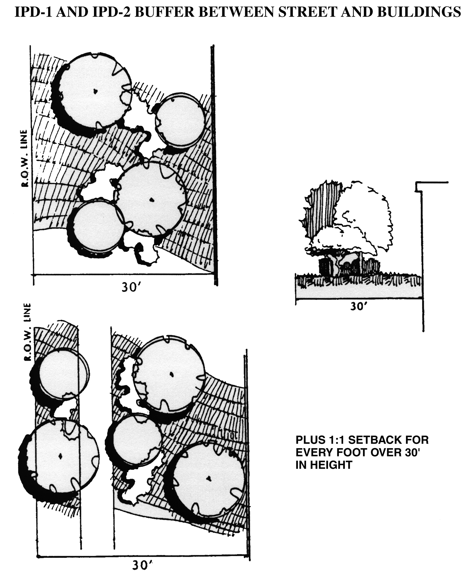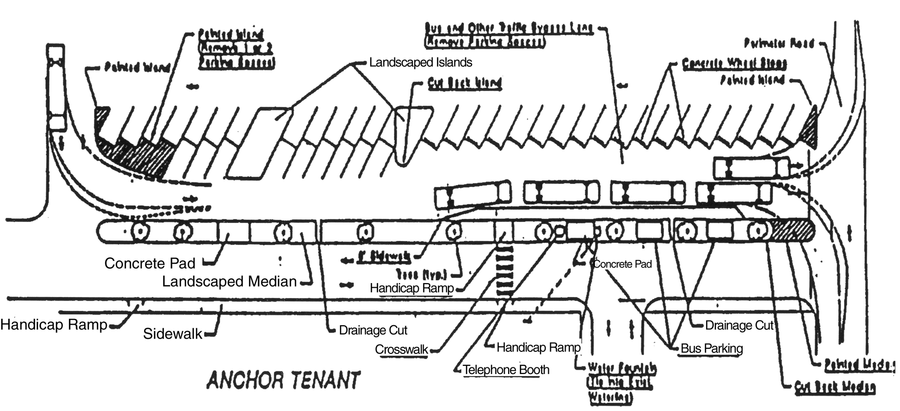 Commercial and office complexes built to the average build line, where the pedestrian walk in the parkway buffer is increased in width to eight feet and located on the property line to provide direct access to stores or offices. Pedestrian breaks which permit access from the parkway to the opposite side of the buildings shall be no more than 200 feet apart along the stores or offices.