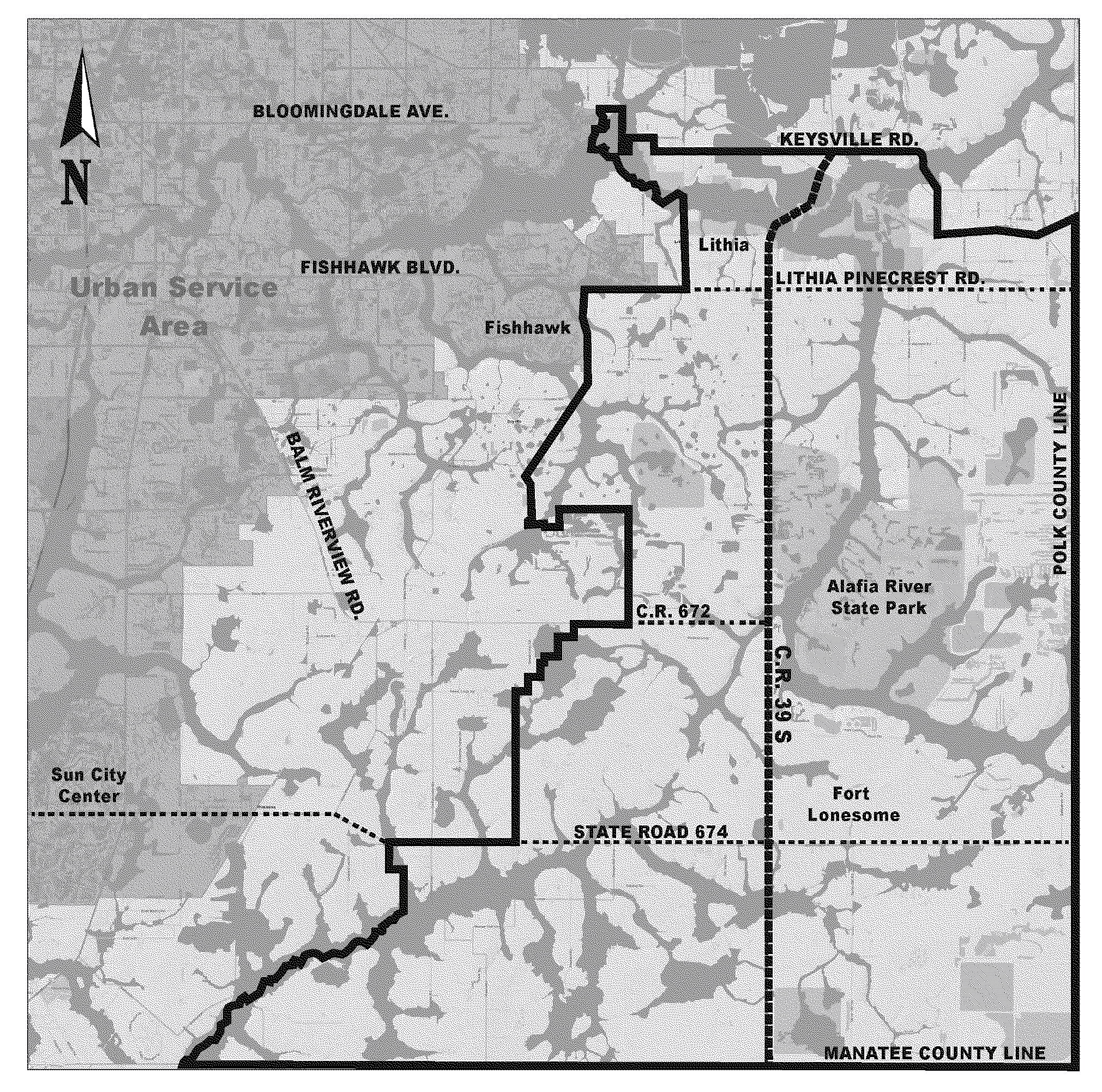 The purpose of this Part is to provide for the Lithia/Southeast County Overlay District and building design standards. The intent of this overlay district is to preserve the rural character and to improve the appearance of new and existing non-residential development within Lithia. The area subject to this overlay is located from the southeastern boundary of the Fishhawk community running east to the Polk County line, then south to the Manatee County line encompassing the areas of Lithia, Fort Lonesome, east CR 672, east SR 674, the Alafia River State Recreation Area, and the C.W. Bill Young Reservoir as depicted on the map below (the LSC Overlay District). The LSC Overlay District establishes standards for the design of certain non-residential uses.