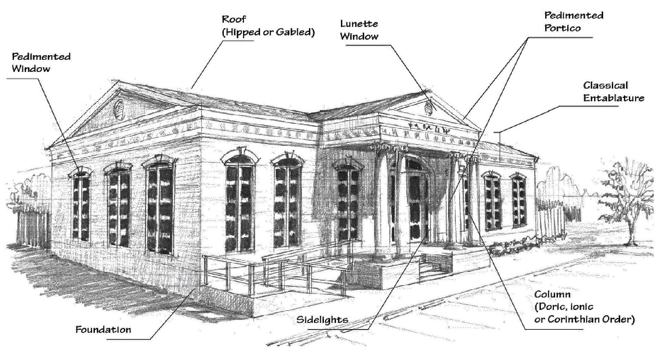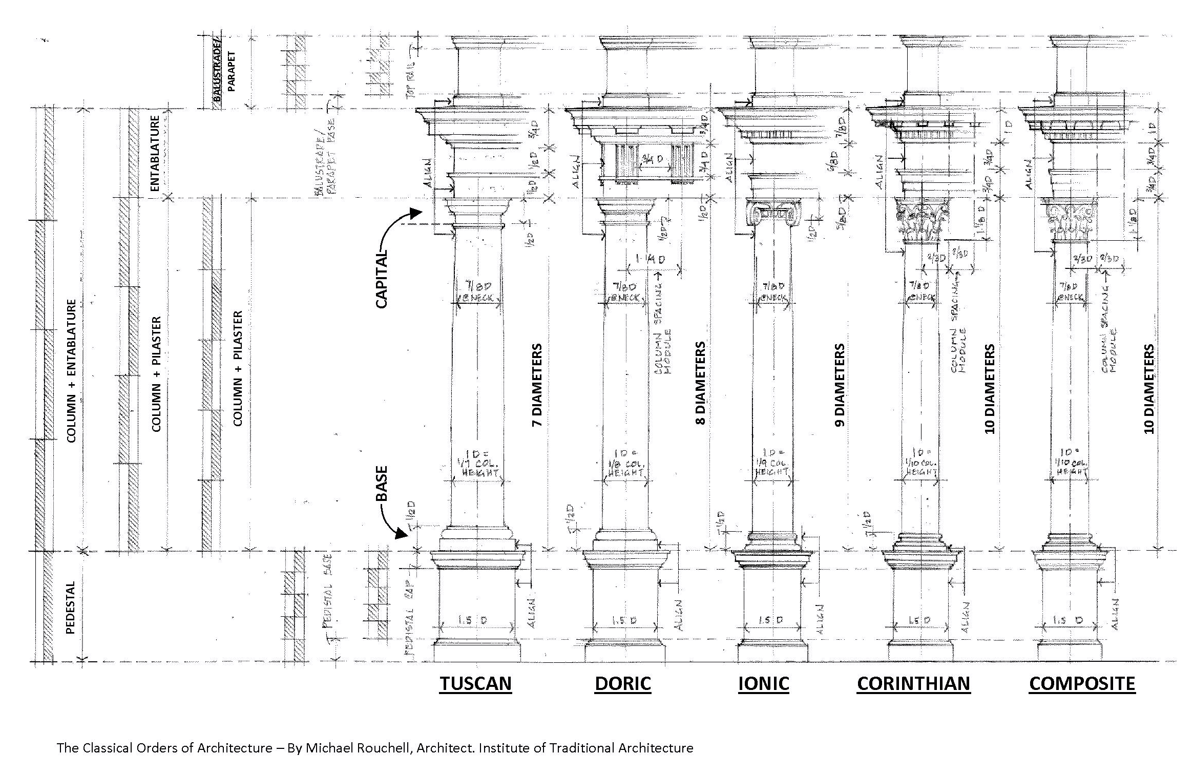 If Greek Revival or Neoclassical Styles are chosen, columns and/or pilasters shall conform to the design and proportions of Figure 2 below. The height and diameter of the column shall follow a ratio depending on its style. For instance, the Tuscan order has a 1:7 ratio, where one equals the column width and seven is the height (a column 10 feet high will need to be 1' 5" in width at its base). Columns shall have a base, a capital, and an entablature.