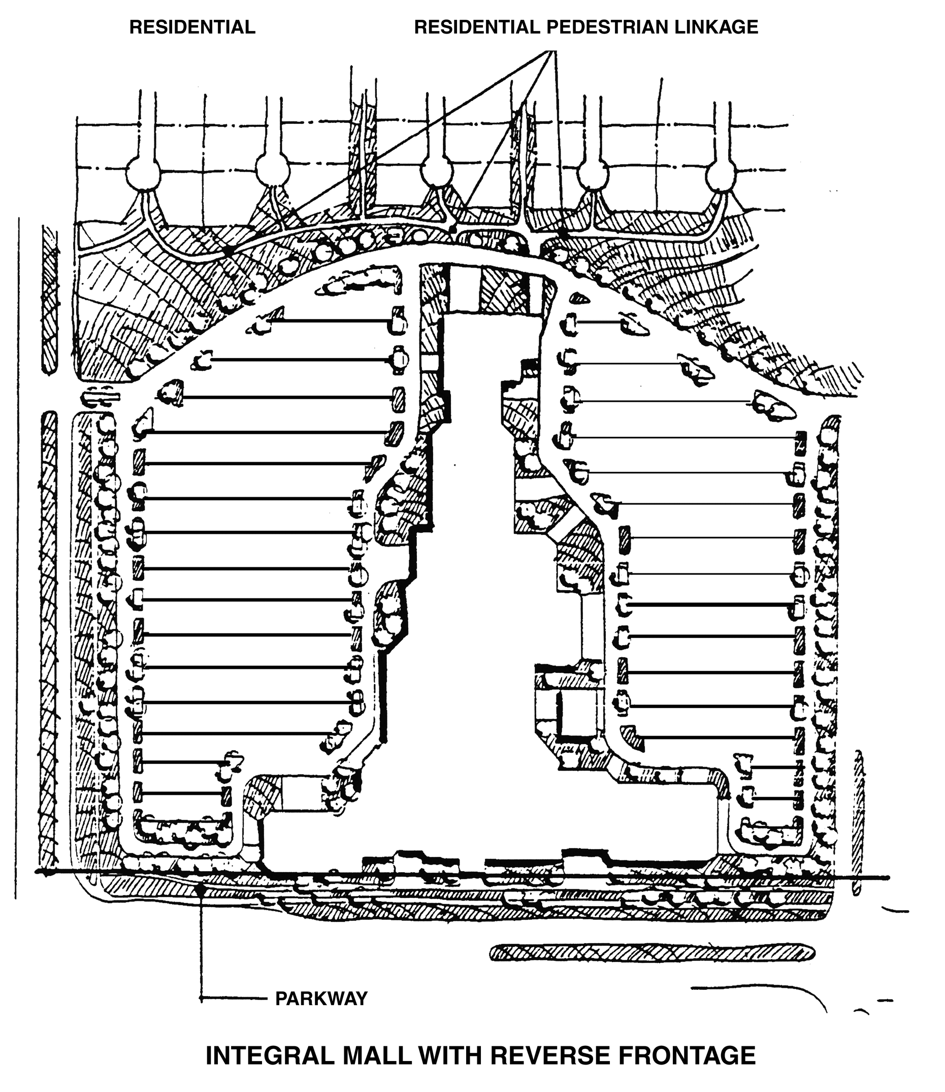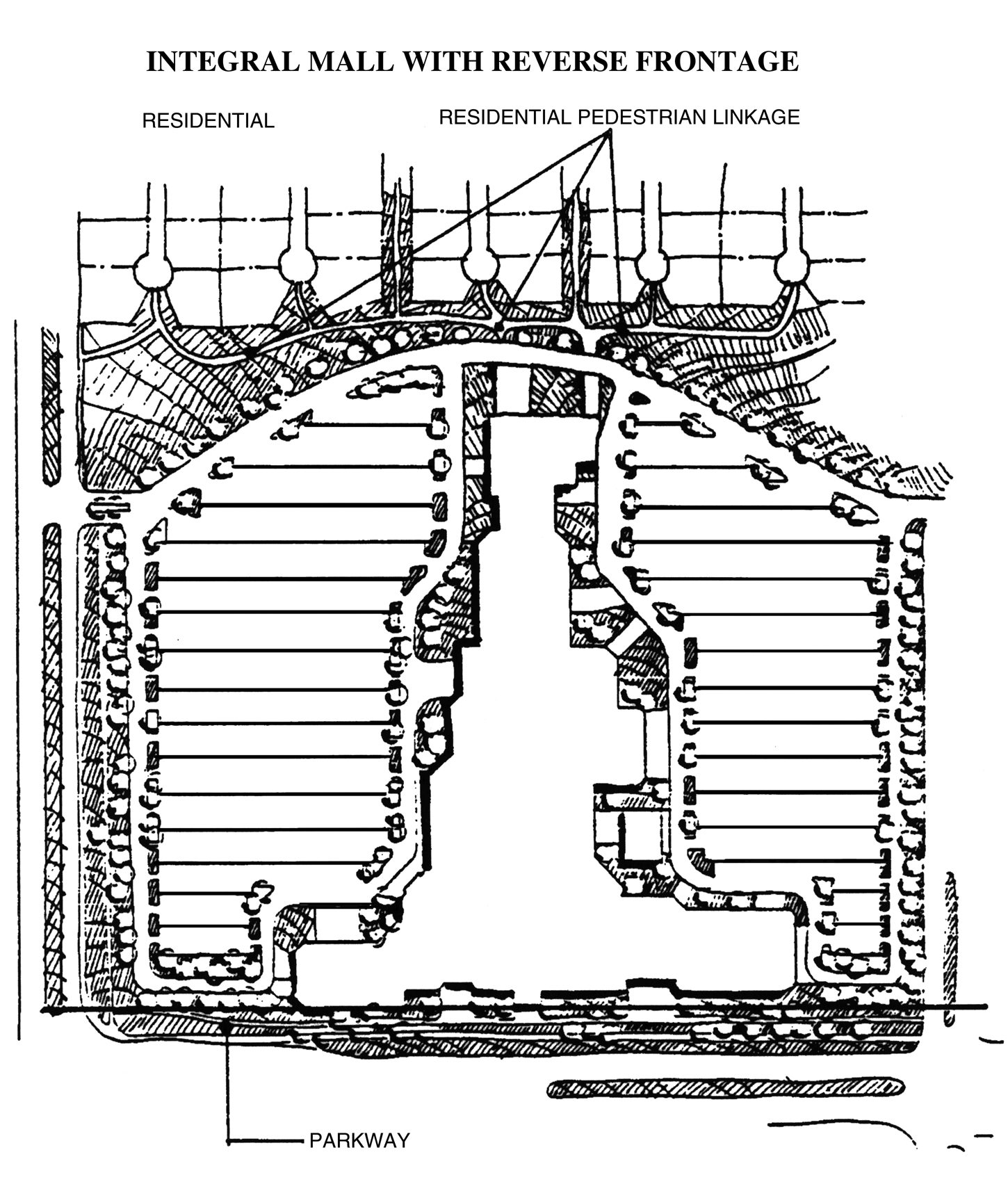Integral mall with direct pedestrian linkage to the parkway and to residential areas.