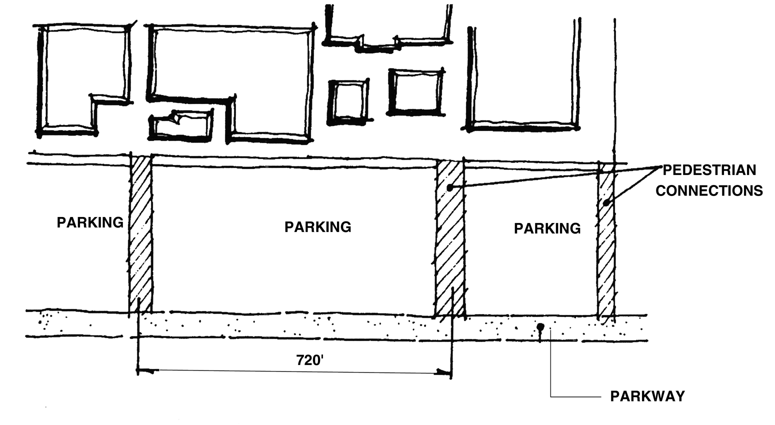 Commercial and office complexes with interior spaces and pedestrian connections to the parkway for each development or every 720 feet, whichever is greater.