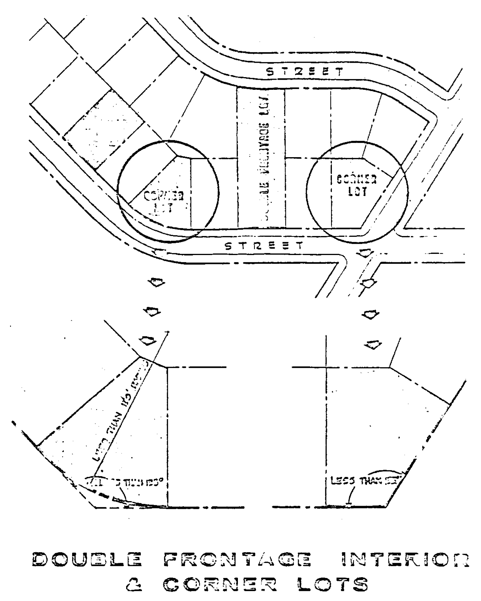 Lot, double frontage, means any interior lot having frontages on any two more or less parallel streets as distinguished from a corner lot. In the case of a row of double frontage lots, all sides of the lots adjacent to streets shall be considered frontage, and front yards shall be provided as required.