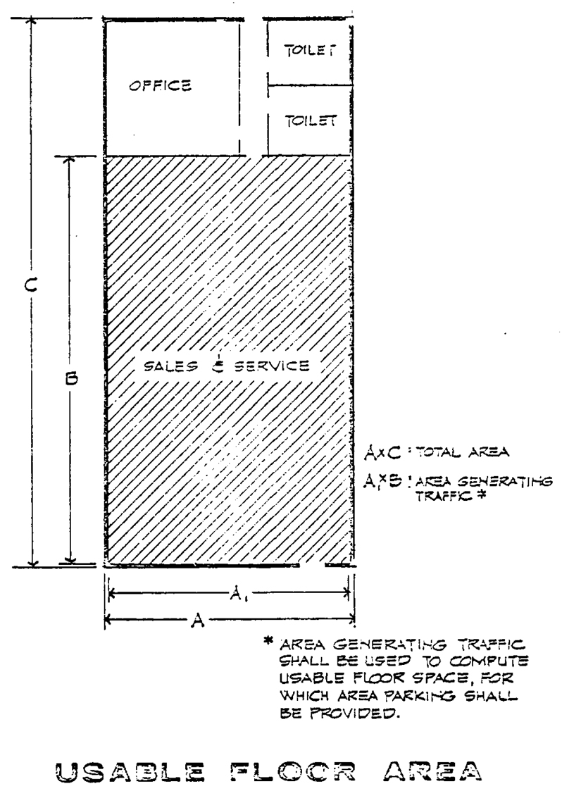 Usable floor area means, for the purposes of computing parking, that area used for or intended to be used for the sale of merchandise or services or for use to serve patrons, clients, or customers. Such floor area which is used or intended to be used principally for the storage or processing of merchandise, or for utilities, shall be excluded from this computation of "usable floor area." Measurement of floor area shall be the sum of the gross horizontal areas of the several floors of the building, measured from the interior faces of the exterior walls.