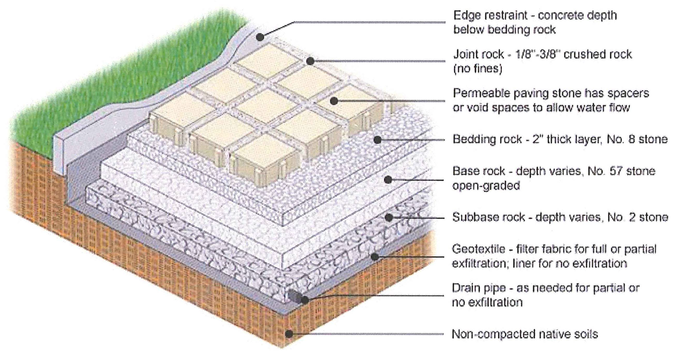 Parking lots may be separated into two separate surface types to be dictated by minimum and maximum parking allowances. Minimum parking allowances must be paved with asphalt, (pervious or impervious) or concrete paving. The remainder of the maximum parking allowance must be paved with a pervious material.