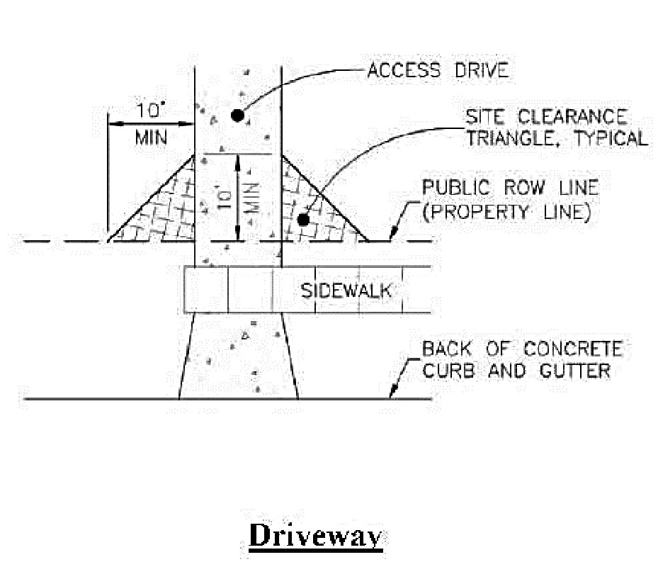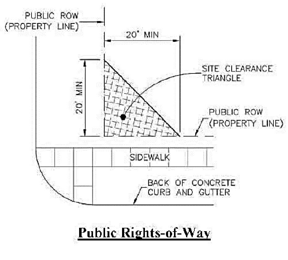 The area formed at the corner intersection of a public right-of-way and a driveway, two sides of the triangle area being ten feet in length measured along the right-of-way line and access drive line and the third side being a line connecting these two sides. For the purpose of plantings located in the lawn extension/terrace, the site clearance triangle extends beyond the right-of-way line to the curb/edge of pavement at an angle perpendicular to both of those lines.