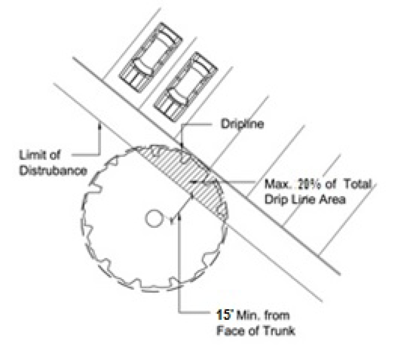 No more than 20 percent of the total area within the drip line of any specimen tree shall be subject to paving or soil compaction, and no paving or soil compaction is allowed within 15 feet of the tree trunk. (See Figure 16-6-104.F.2: Limits of Paving or Compaction near Specimen Trees.) The Official may allow paving or soil compaction beyond the 20 percent limit if low impact development techniques (e.g., pervious pavers, materials placed at or above grade, no use of mechanical machinery) are used as an alternative means of protecting the specimen tree.