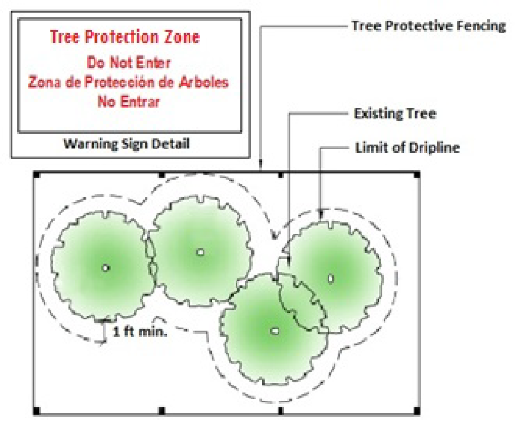 Warning signs shall be installed along any required tree and buffer protective fencing at points no more than 150 feet apart. The signs shall be clearly visible from all sides of the outside of the fenced-in area. The size of each sign must be a minimum of two feet by two feet. The sign message shall identify the fenced or marked area as a tree or buffer protection zone and direct construction workers not to encroach into the area (e.g., "Tree or Buffer Protection Zone: Do Not Enter"). (See Figure 16-6-104.J.2: Tree Protective Fencing and Signage.)