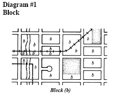 Block: A unit of land bounded by streets or by a combination of streets and public land, cemeteries, railroad rights-of-way, shorelines of waterways, or any other barrier to the continuity of development (See Diagram #1).