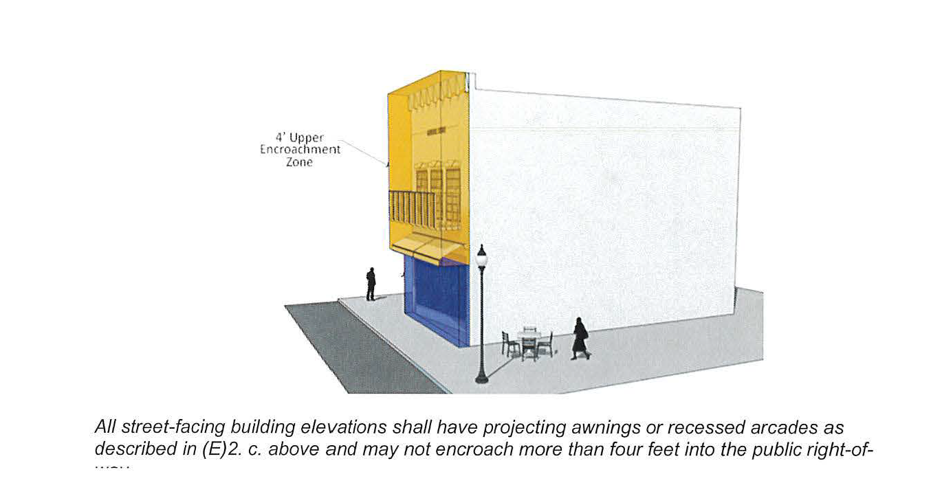 All principal-street facing building elevations shall be equipped with either awnings above the first floor, or recessed ground floor arcades extending the full length of the building. Arcades must be indented at least four feet back from the main façade plane (four-foot overhang). All awnings must be constructed of durable materials, be non-retractable, and be permanently affixed to the façade surface.