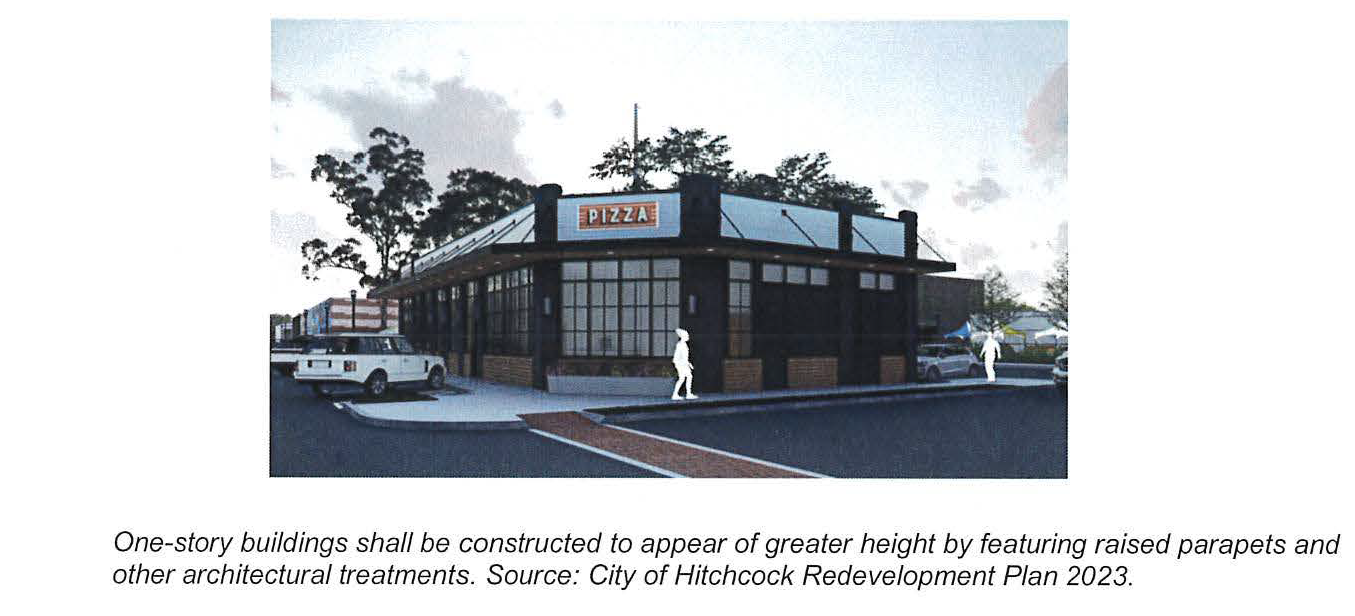 One-Story buildings. In the Downtown Mixed-Use District, buildings that are functionally one-story shall be constructed to appear of greater height in relation to the street. This can be achieved through raised parapets; the use of an intermediate cornice line to separate the ground floor and the upper level; or in limited cases, the use of pitched or gabled roofs.