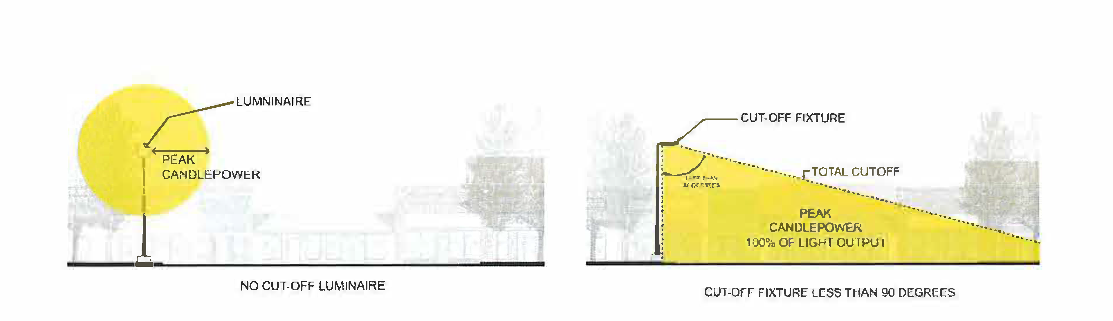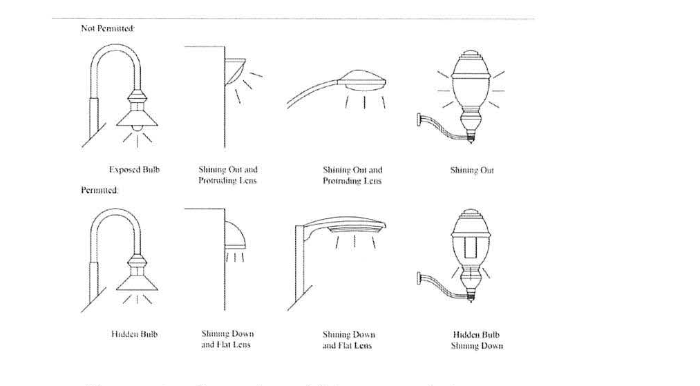 As shown in Exhibit XXXX below, to minimize glare and diffusion of light onto adjacent properties, all pole mounted lights within the Downtown Mixed-Use District shall either use hooded, cut-off fixtures that project downward at under a 90-degree angle from the light source or have a maximum footcandle strength of 0.5.