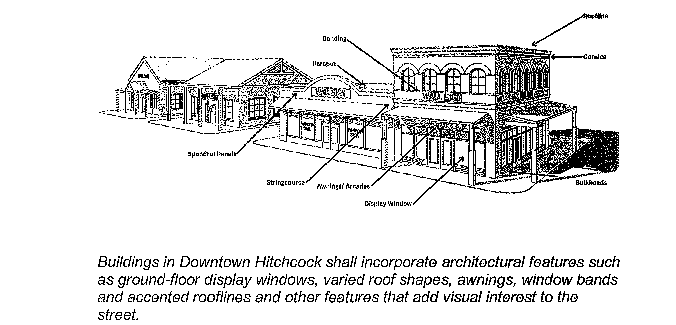 Window-bands, canopies, parapets, spandrel panels, decorative brackets, pilasters, cornices and articulated rooflines;